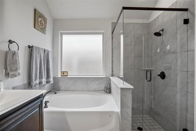 A 3-bedroom, 2-bath, 2-car garage home with an open floor plan is perfect for entertaining and living, and featuring simulated wood grain ceramic tile flooring throughout main traffic areas. The kitchen opens up to the family room with a spacious island. The stunning bay window will brighten your day with natural sunlight. Family room boasts an inset theatre-style area with accent lighting, perfect for movie nights. The primary bedroom has an elongated window seat, a large walk-in closet, dual sinks, a garden tub, and a step-down shower. You will not lack room for organizing with full attic decking or creating additional living space. This property has an essential covered front porch and covered back patio.