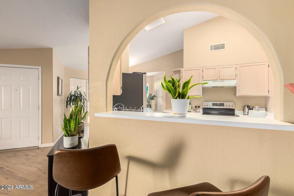 Discover easy North Phoenix living in this bright and inviting Parcside home! Soaring ceilings and an open layout create a spacious feel,while the cozy fireplace and soft tones bring warmth and comfort. The kitchen offers light wood cabinetry,all appliances,and a sunny breakfast nookperfect for morning coffee. The primary suite features vaulted ceilings,dual closets,and a spa-like bath retreat. Step outside to your private backyard haven with a covered patio,privacy walls,and low-maintenance landscaping. Conveniently close to trails,shopping,dining,and top-rated PV schoolswith quick freeway access. Plus,brand-new vinyl flooring in all bedrooms and zero carpet throughout!