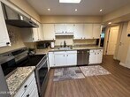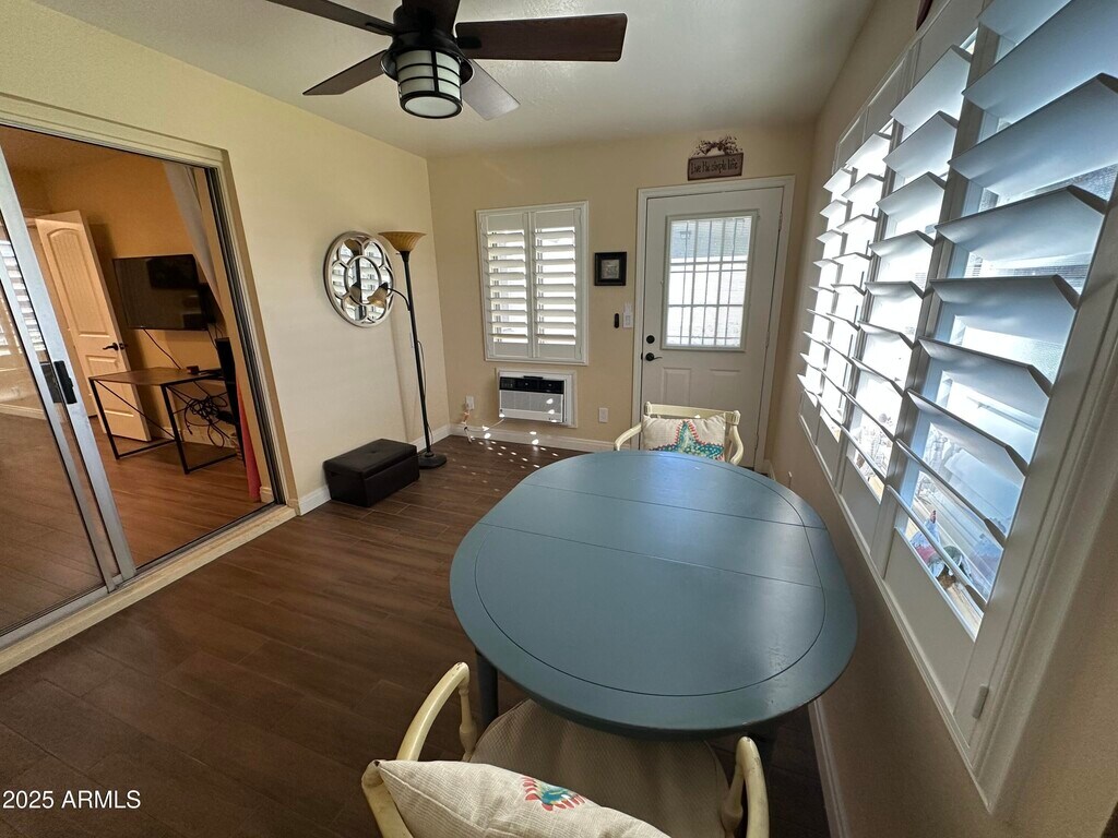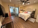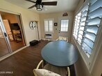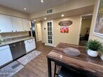 Furnished 2 bedroom,1.75 bath with a sunny AZ room. Master bedroom has 3/4 bath and walk-in closet. Full hall bath. Second bedroom has built-in desk. Eat-in kitchen includes refrigerator and built-in microwave and lower cabinet pull-outs. Living room has nice laminate wood flooring,crown molding and nice interior paint. 1 car garage with opener and built-in shelves. Washer and dryer included. Back patio faces open green space. Located in quiet area. North-south orientation.