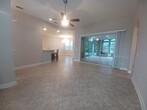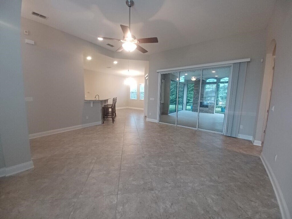 This spacious 3/2 home is situated on a cul de sac with a lake at the end. 12' ceilings in the living, dining and kitchen and the open floorplan make it light and airy. The living room opens onto a large screened room with summer kitchen and fireplace with a tv nook above it. The split plan offers privacy for the primary bedroom. The primary bedroom features 2 walk in closets and the primary bath has both a soaking tub and walk in shower. Washer and dryer are included. The backyard is fenced and backs to a wooded area. The home features a spacious 2 car garage. Access to tennis and the ballfield are included. Tenant will have to pay for pool access. There is a water softener system and lawn service and pest control are included.