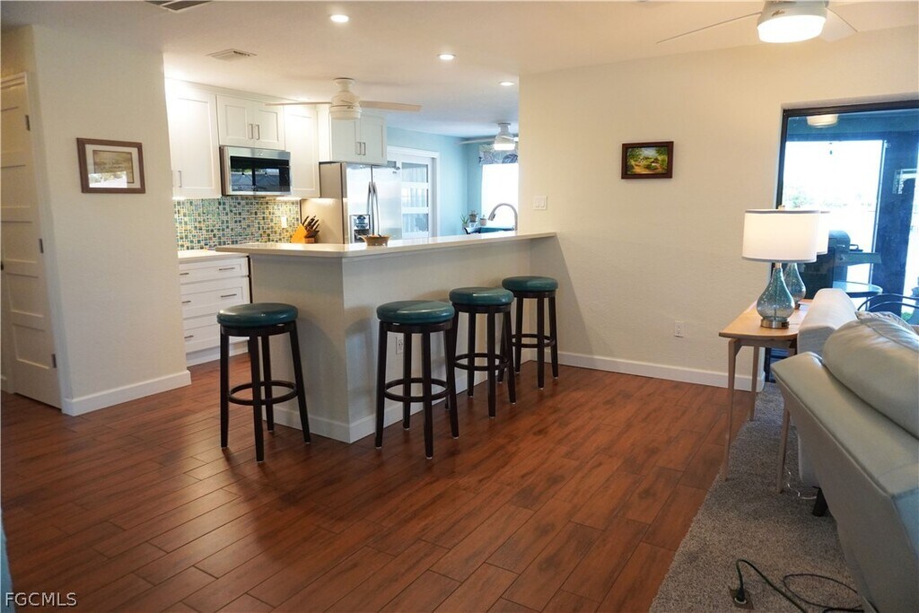 Wonderful canal home with Gulf access,updated kitchen,screened lanai with long water views from all rooms and concrete dock. Walking distance to Cape Coral’s finest restaurants and entertainment. House features open floor plan with split bedrooms,large master bedroom,interior laundry room,2 car garage and ample closets. BONUS: Fiber internet,lawn maintenance,pest service,washer and dryer,and most electric included. (Solar home; details explained at viewing.) Double Bonus: 75” wall mounted TV and 2nd refrigerator also included! Enjoy Florida living!