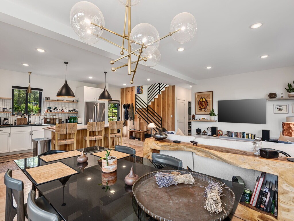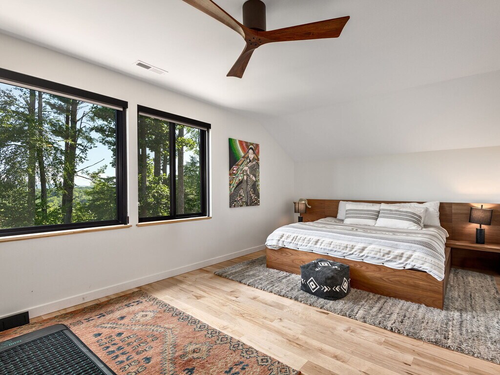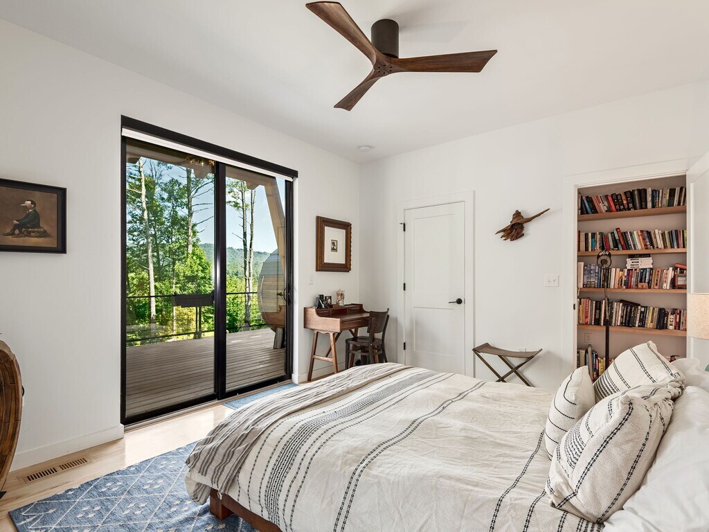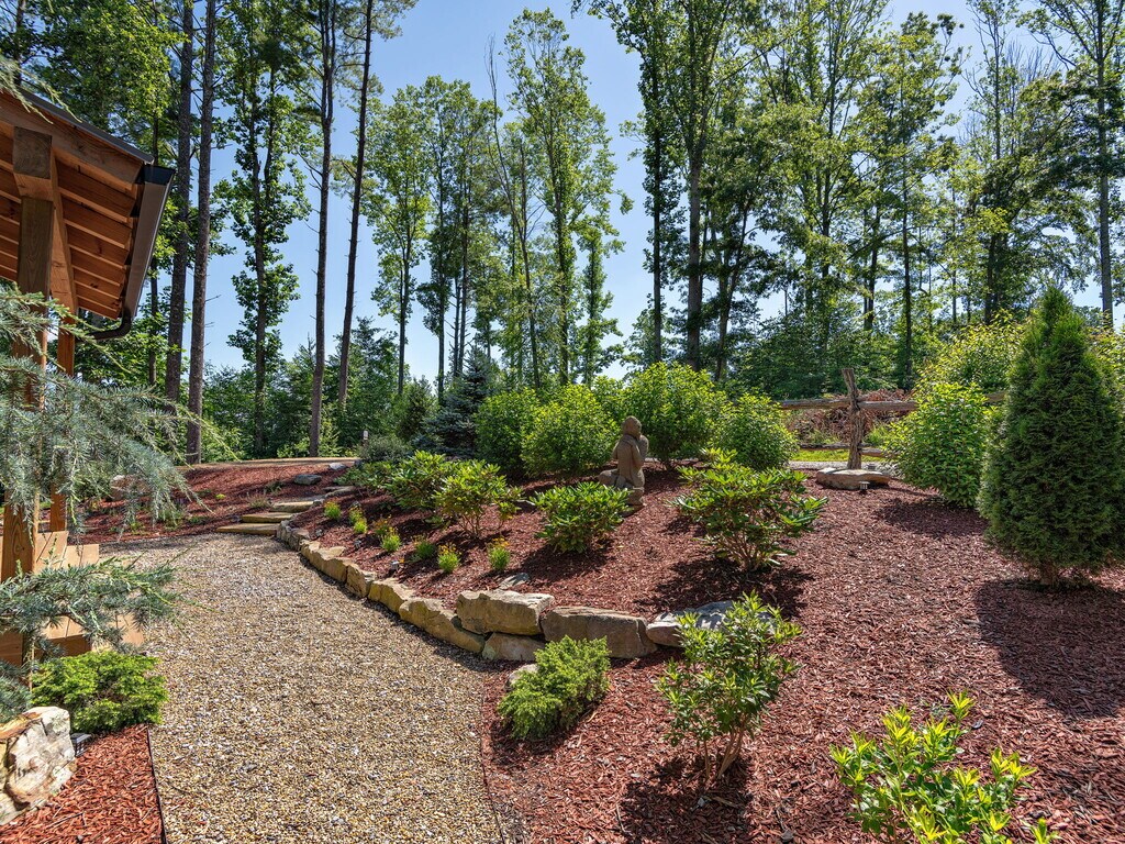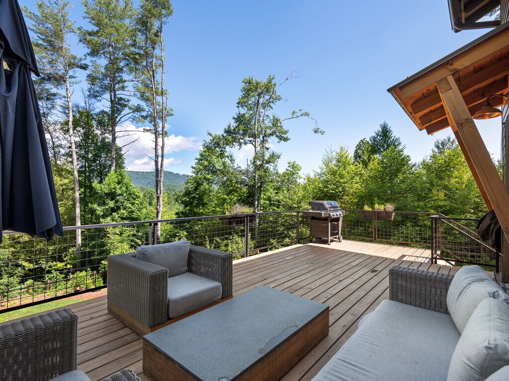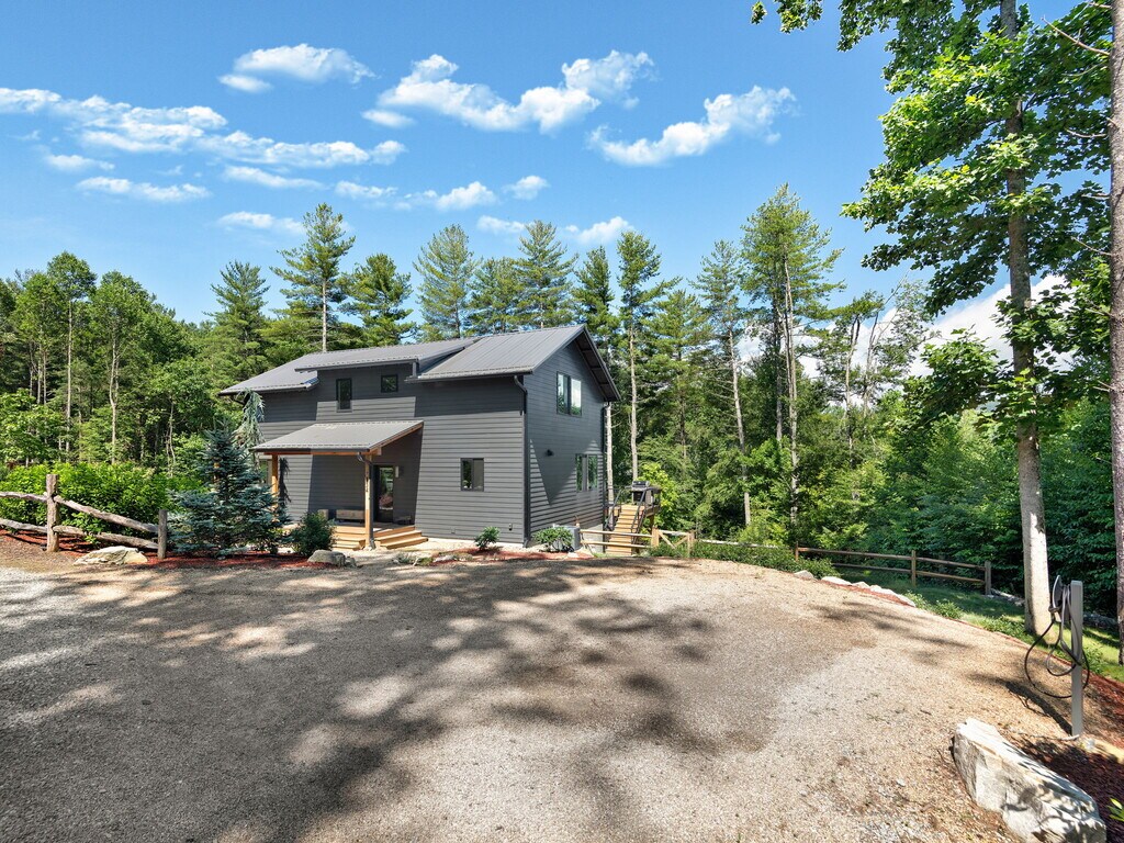 Discover a rare mountain retreat in Mills River, perched on nearly an acre in a quiet, private road community of modern Green Certified/ENERGY STAR homes. Surrounded by wildlife, apple trees, blueberry, and blackberry bushes, seasonal wildflowers, and no-mow landscaping, this fenced backyard offers privacy and low-maintenance living. *This house is un-furnished. This home blends wellness, sustainability, and high-end design. It features low-VOC finishes, a whole-house water filtration system, and an advanced HEPA air system for optimal indoor air quality. Recently refinished hardwood floors and fresh interior paint give the home a fresh, like-new feel. The open-concept main level includes a spacious kitchen, dining, and living area with premium designer fixtures, a first-floor bedroom with ensuite bath and deck access to mountain views, and a convenient half bath. Upstairs, the primary suite offers a luxurious ensuite and large closets, complemented by another full bedroom with bath access and an additional guest/bonus room. The finished lower level with separate driveway and entrance is perfect for a private studio or in-law suite. A large, deep deck captures sweeping year-round mountain views, ideal for entertaining or relaxing. Additional features include 220V Tesla/electric vehicle charger wiring, 220V sauna outlet on deck, a whole-house generator (2023), and ample storage throughout. Designed by a renowned interior designer from Lenny Kravitz’s New York design firm, this home combines luxury, sustainability, and comfort across three full floors.