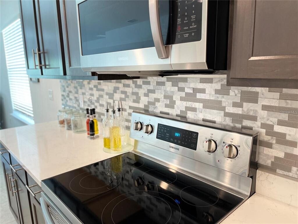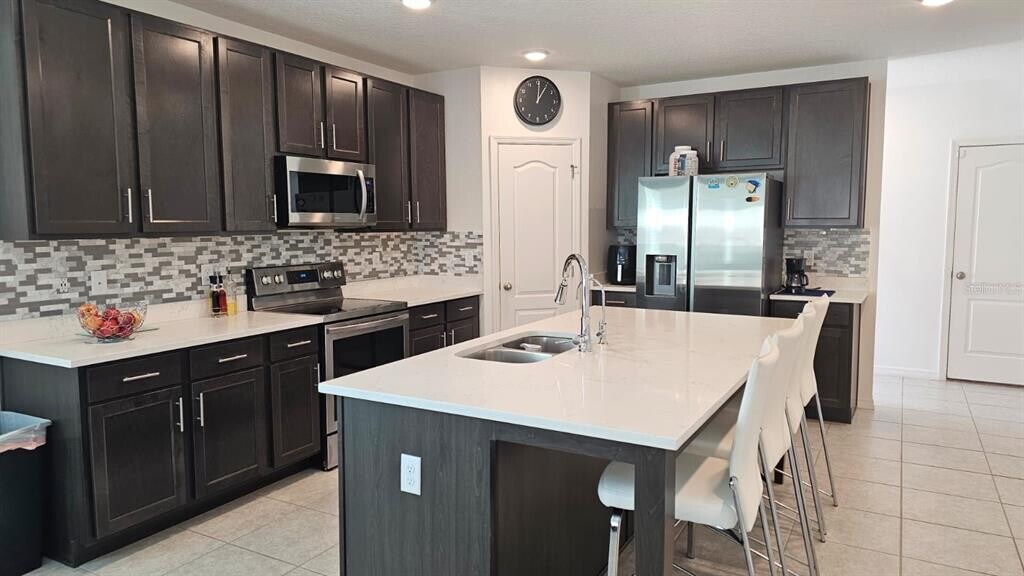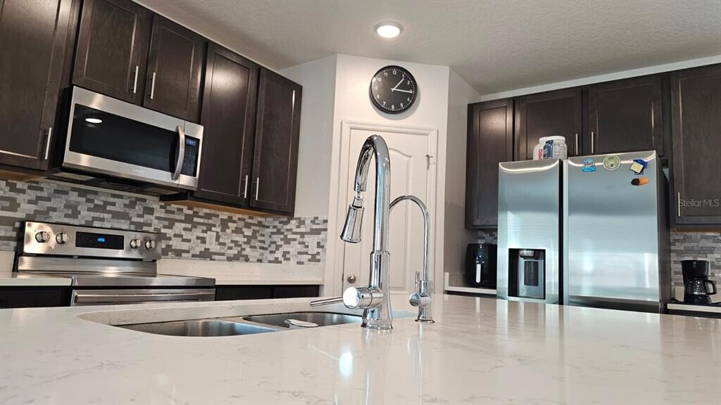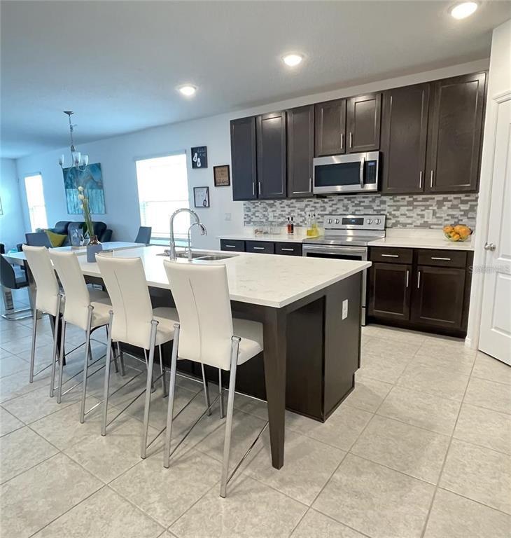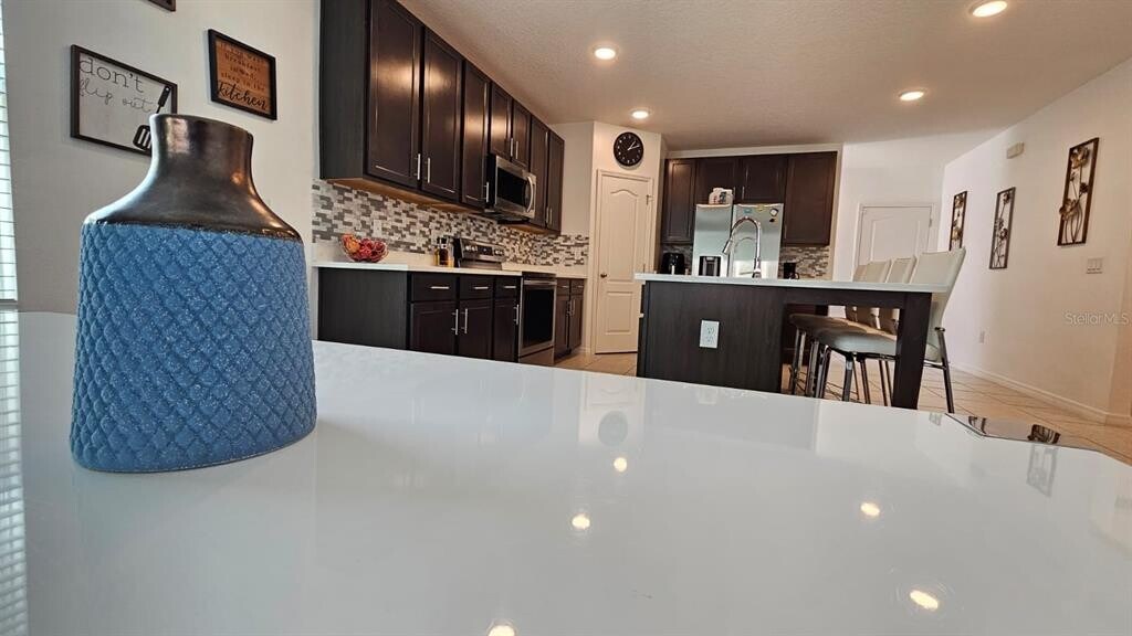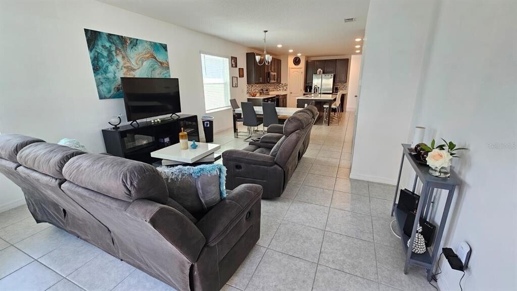 Built in 2020,this beautiful 4-bedroom,2-bathroom home is in excellent condition. It boasts a lovely water view and a beautifully landscaped garden. The entire house features ceramic tile flooring,wood cabinetry,stainless steel appliances,a backsplash,luxurious quartz countertops,and a large island (breakfast bar). Located in a quiet neighborhood close to schools,it's approximately 30 minutes from downtown Orlando and 35 minutes from major attractions. Lawn maintenance is not included. A water purifier is included. Furniture is not included. MLS# S5145101