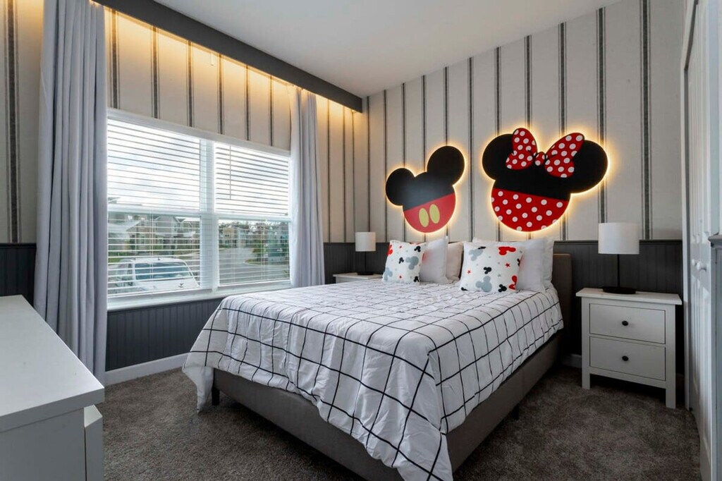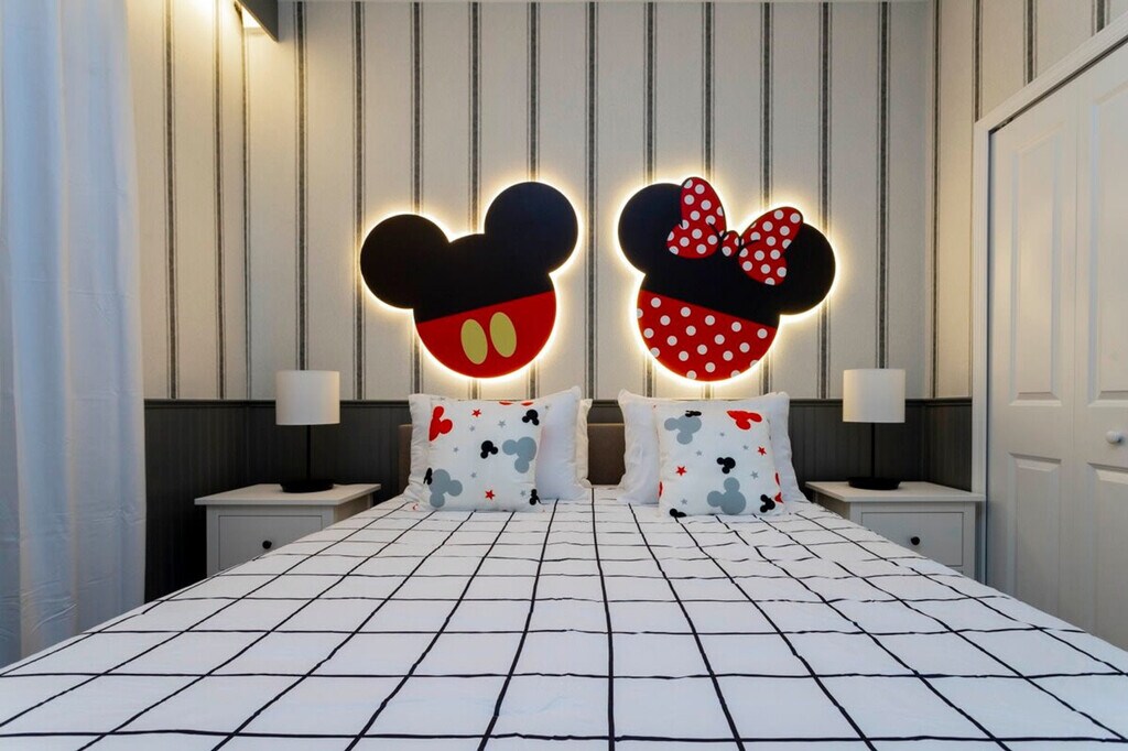 Luxuriate in the utmost comfort and style with this beautiful 5-bedroom townhome, featuring three distinct and visually stunning themed bedrooms: Mickey Mouse, Frozen, and Harry Potter. Take a refreshing dip in the private pool or explore the resort's clubhouse for all the recreational activities that it offers. Visit the nearby Disney Theme Parks, stores, and restaurants for added excitement during your stay, all located just minutes away. Make magical memories with your family and friends that will last a lifetime. Welcome to this luxury and beautifully decorated villa that offers plenty of space for up to 12 guests. Upon arriving at this property, you will be welcomed into a spacious living room that integrates into the dining room and kitchen for the perfect entertainment space. The kitchen is fully equipped with all the necessary amenities for cooking and dining. There is also a private heatable pool in the outdoor area for guests to enjoy. The property has 5 bedrooms spread across two floors. On the first floor, you will find the Mickey bedroom with a queen bed and a Frozen bedroom with two full beds that share the same bathroom. On the second floor, you are welcomed to two king suites and a Harry Potter themed bedroom with two twin beds with its own bathroom. Other amenities in this property include free Wi-Fi, parking, a laundry space with washer and dryer, and a welcome package of basic bathroom and kitchen supplies. Replenishment of bathroom and kitchen amenities is the guest's responsibility. Heating the pool is a paid service and there is also a fee charged to use the barbecue grill. Storey Lake Resort has the perfect location just 10 minutes from all major attractions and theme parks in Orlando, including Walt Disney World, Universal Resort, and Sea World. You will find fantastic resort amenities for the whole family to enjoy, with a tiki bar, a resort-style pool with slides and lazy river, sports court, mini-golf, kayak, and fitness center. There are two clubs inside the property, one of them with a themed pirate pool that kids will love, just walking distance from the house. Located just off Osceola Parkway, the resort has easy access to restaurants, shopping, and supermarkets, all within a 5-minute drive. Quiet hours are between 22:00 and 8:00. [SI]