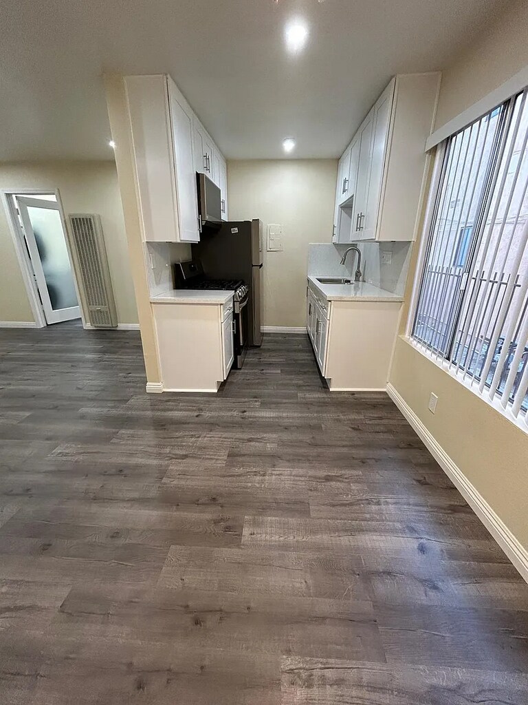 One bedroom with large closet and abundant natural light Stylish new kitchen featuring new stainless steel appliances, quartz countertop and plenty of cabinet space. Modern bathroom with contemporary tile work, updated vanity and new fixtures. Open concept living room with beautiful PVC floor In-unit washer and dryer for added convenience. One parking space in gated area