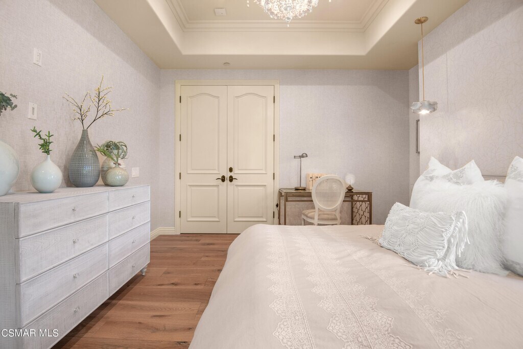 Available furnished or unfurnished. Extremely rare single story showpiece estate in the heart of North Ranch. Situated up a long privately gated drive leading to only four homes, this trophy estate offers unparalleled views from almost every room. An exemplary 1.3 acre lot located in the tucked away Cresthaven Private Estates, offers the utmost privacy and tranquility. Offered fully furnished, with top of the line furniture from notable design houses such as Maitland Smith, Marge Carson, John Richards, Restoration Hardware and more as well as custom lighting throughout by Fine Art Handcrafted Lighting. As you enter, you'll instantly notice the floor to ceiling glass in the formal living room ahead showcasing incredible mountain views. To your left, a beautiful office with newly constructed coffered ceilings and a fireplace. Adjacent to the entry you'll find an incredibly warm dining room with custom lighting and window treatments. A substantial chef's kitchen opens to the breakfast and family rooms, where you can really enjoy your family and friends while cooking. The kitchen features a large center island with Viking range and oversized Miele refrigerator and freezer. This meticulously maintained home features approx. 6,300 Sq.Ft. of living space with 5 Bedrooms and 6 bathrooms, each bedroom featuring its own en suite bath. A separate den area off the family room is perfect for a bonus or game room. The spacious family room offers a fireplace and custom built-in bar with onyx counter tops, icemaker and refrigerator. Another striking feature is the brand new custom built walk-in wine cellar that is temperature controlled to store the finest of wines. The family room also offers explosive views via stunning folding glass pocket doors for seamless indoor/outdoor living. The sizable primary suite features heated Crema Marfil marble floors, a cozy fireplace and high ceilings. Step into the luxurious primary bath offering two beautifully appointed vanities, dressing table and spacious steam shower. A perfectly positioned soaking tub takes advantage of the sensational views. Off the primary bathroom, you'll find an expansive walk-in closet with custom-built-ins and designer carpeting. Walk out back to enjoy a spectacular private entertainers backyard with no expense spared. Special features include an approx. 1,000 sq. ft. of covered terrace with hidden TV's that drop down via an electronic lift. Enjoy a warm day in the infinity pool with fiber optic lighting and wonderfully sized jacuzzi that can also be used as a picturesque fountain. A top of the line outdoor kitchen features a pizza oven, refrigerators, icemaker, BBQ, multiple beers on tap and more. Meander the pathways through an organic fruit orchard with almost every kind of fruit tree you can imagine, including an olive grove of approx. 30 olive trees, all beautifully lit up at night. An exceedingly rare opportunity to enjoy this one of a kind masterpiece. A very special offering that rarely comes to market.