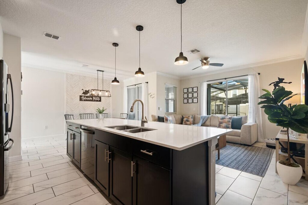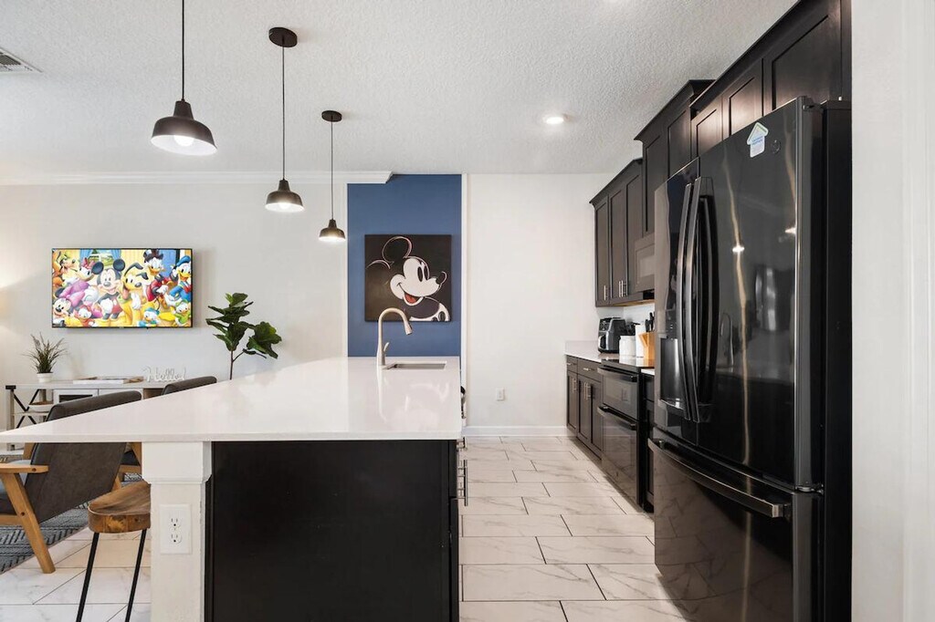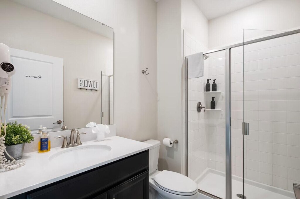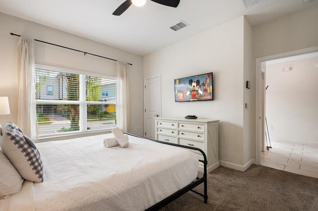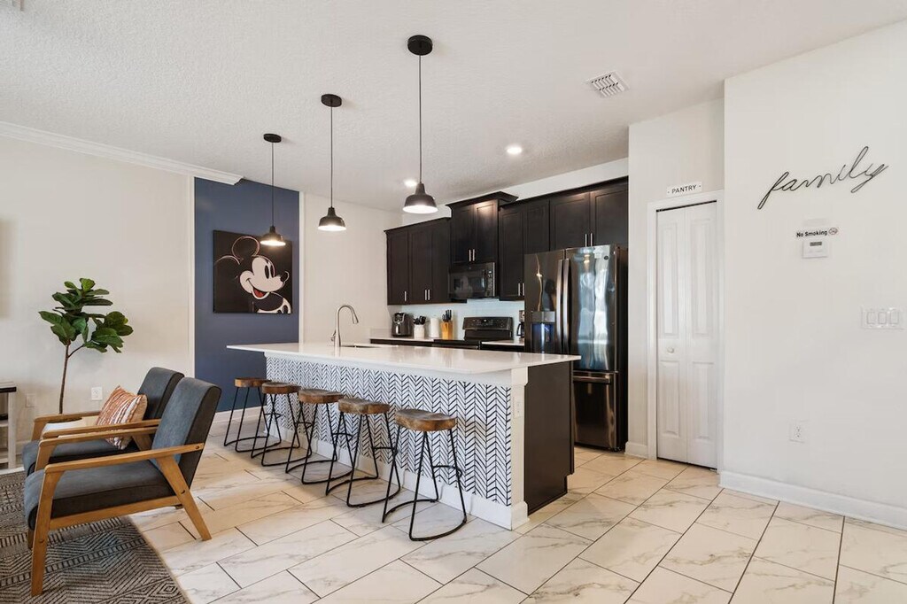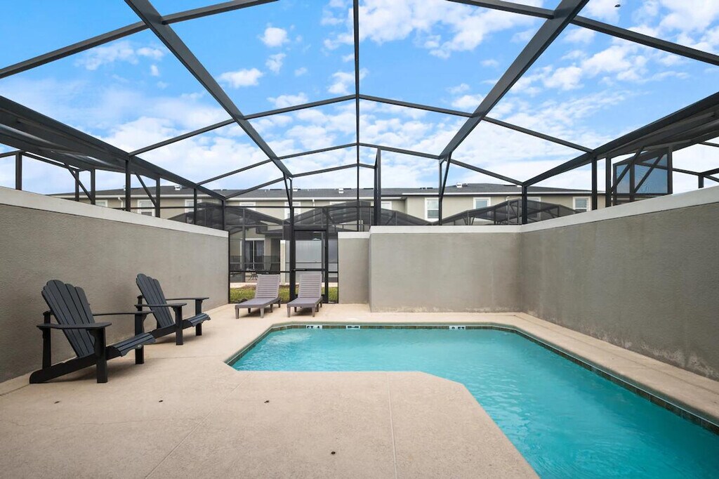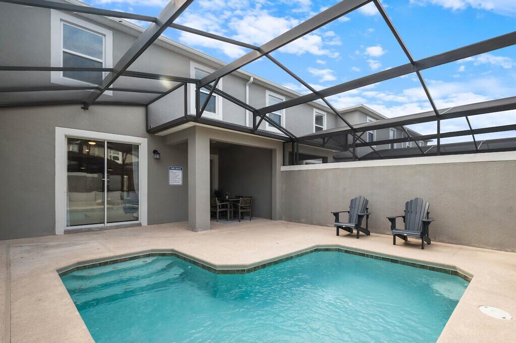 Feel at home in this beautifully designed townhouse, the perfect family getaway located in the prestigious Storey Lake Resort and minutes from Orlando’s top attractions. This home sleeps 12 guests and features 4 bedrooms and 3 full bathrooms. This home features a dining and living area with a table for 6 and 5 bar stools, and a Smart TV. The fully equipped kitchen features modern appliances, pots, utensils, a coffee maker, and a toaster. Enjoy access to the Storey Lake Resort, including a water park, lazy river, gym, and more. For families with children, a baby gate, high chair, pack and play, and stroller are provided. Enjoy complimentary starter supplies such as paper goods, soap, shampoo, and detergent. Enjoy access to a private heated pool with optional heating for $35 per day. Up to 2 dogs are welcome for a $150 pet fee. Only 6 miles from Disney, this home is minutes from parks, dining, and shopping. Enjoy easy access to Animal Kingdom, Hollywood Studios, EPCOT, Disney Springs, and Magic Kingdom. SeaWorld and Universal are also within a short drive. The pool is serviced weekly. Bringing your furry friend? Please keep your pets leashed outside, never leave them unattended in the home unless crated, and clean up after them. Maximum of three cars per reservation. No RVs, campers, or trailers allowed. You have full access to the entire property, inside and out, except for the owner's closet. Enjoy effortless access with the smart door lock. Present a government-issued photo ID that matches the reservation name to enter the community. Register your vehicle at the main gate to receive your car pass. You can request mid-stay cleaning for an additional fee. Pool heating is required for the entire stay and will be invoiced separately. During the winter season (Dec 21 - Mar 20), if the external temperature is too low, the heating may not reach expected levels. Avoid using the pool during cold or rainy weather. [SI]