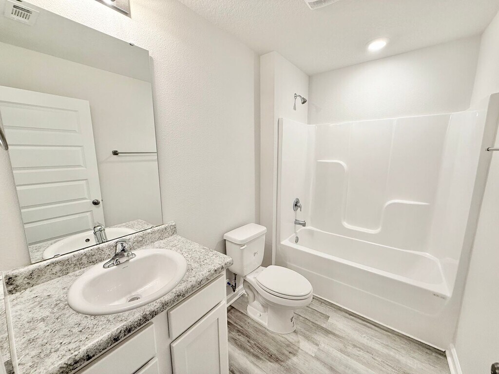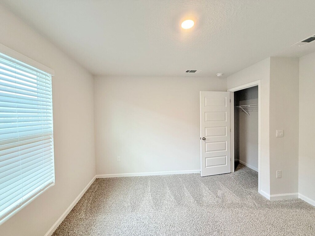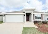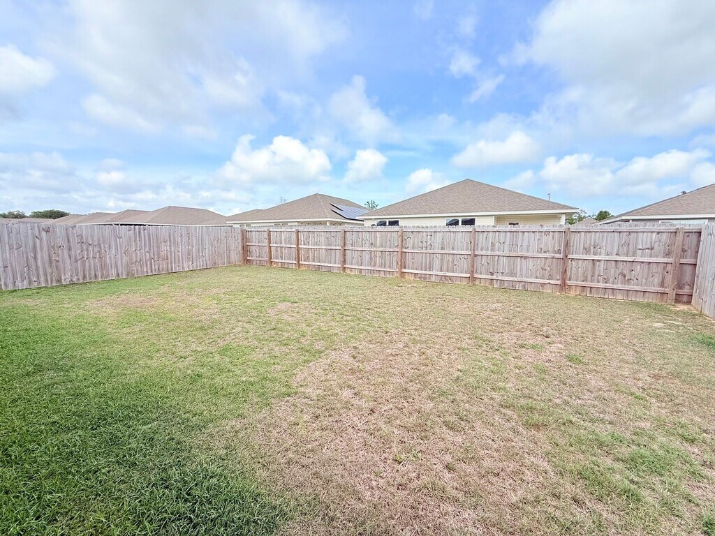View In 3D: This beautifully designed home is located in the charming Woodlands neighborhood in Pace. This property features luxury vinyl plank flooring in the main living areas and carpet in the bedrooms, along with a spacious open-concept layout perfect for comfortable, functional living. The open-concept kitchen is equipped with an eat-in area, a large island with a hop-up bar, a dual basin sink, ample counter and cabinet space, and stainless steel appliances including a French-door refrigerator, flat top range, built-in microwave, and a dishwasher. The primary bedroom is generously sized and offers an ensuite bathroom with a private water closet, double vanity, large walk-in shower, and a walk-in closet. Three additional bedrooms share a second full bathroom with a single vanity and a tub/shower combo. Additional highlights include a washer and dryer, a covered back patio, a 2-car garage, a spacious fully-fenced backyard, and access to the community park and splash pad.
