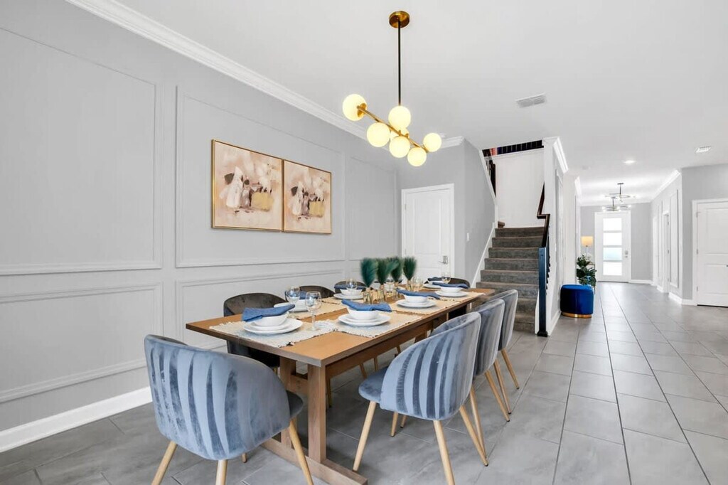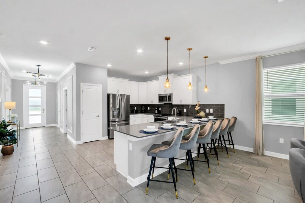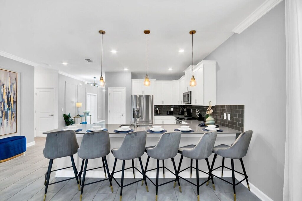 Discover unparalleled luxury in this exquisite 9-bedroom Storey Lake retreat, located near Orlando's top attractions with an amazing clubhouse. Immerse yourself in themed extravagance, featuring Mickey, Minions, Moana, Star Wars, and more in the enchanting bedrooms. Experience cinematic magic in the Mickey-themed movie theater and embark on epic adventures in the Avengers-themed game room. Delight in your private pool and the comfort of a spacious living room. This home is a true gem, offering a unique blend of opulence and fun. Step into a world of unmatched luxury and endless fun in this exceptional 9-bedroom haven. Immerse yourself in the enchanting ambiance of your favorite characters, brought to life in every corner of this home. Indulge in the lap of luxury as the exquisitely designed living room seamlessly connects with the dining area and fully equipped kitchen. Outside, lounge in style on the patio's comfortable chairs beside your private heatable pool. Prepare for ultimate family entertainment in the meticulously themed Avengers game room, where both adults and kids will find boundless joy. The first floor offers a king bedroom and a master king bed suite for supreme indulgence. On the second floor, a Mickey-themed home theater invites you into a world of cinematic splendor. Explore six more rooms, each uniquely themed: three king bedrooms, a Mario Bros-themed room with a bunk bed with 2 double beds, the Minions room with 2 bunk beds both with single beds and a playful slider, the adventurous Moana room with a bunk bed with double and single beds, and the space-age Star Wars room with a queen bed. This luxurious haven is further complemented by a convenient laundry room, complimentary WiFi, free parking, and a thoughtful welcome kit. Replenishment of bathroom and kitchen amenities is the guest's responsibility. Heating the pool is a paid service and there is also a fee charged to use the barbecue grill. Storey Lake Resort has the perfect location just 10 minutes from all major attractions and theme parks in Orlando including Walt Disney World, Universal Resort and Sea World. You will find fantastic resort amenities for the whole family to enjoy with a tiki bar, a resort-style pool with slides and lazy river, sports court, mini-golf, kayak and fitness center. There are 2 clubs inside the property, one of them with a themed pirate pool that kids will love is just walking distance from the house. Located just off Osceola Parkway, the resort has easy access to restaurants, shopping, and supermarkets, everything within just a 5-minute drive. Quiet hours are between 22:00 and 8:00. [SI]