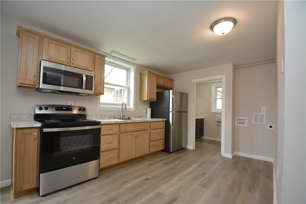 Move-In Ready! This updated 1-bedroom,1-bath ranch unit in the heart of Penfield offers the ultimate low-maintenance lifestyle with ALL UTILITIES INCLUDED (Heat,Electric,Water,Refuse,Lawn Care,and Snow Removal). Step inside to a freshly painted interior featuring a neutral palette,durable laminate flooring,and updated lighting throughout. The spacious eat-in kitchen boasts maple shaker cabinetry and a full suite of stainless steel appliances,including a microwave,oven-range,and refrigerator. The updated main bath features a modern vanity,a clean fiberglass tub/shower,and a luxury heated towel rack! Enjoy the convenience of first-floor laundry hookups and a large living room with a ceiling fan. The primary bedroom is sized for a King-size bed and includes ample closet space. Bonus features include energy-efficient vinyl windows and a detached spacious almost 2 car garage with an automatic opener,plus additional off-street parking. Enjoy the warmer weather outside on your patio/deck area that backs to level green space and evergreens! Unbeatable location—just minutes from the Village of Penfield,Wegmans,Starbucks,local parks,and expressways for a quick commute to downtown Rochester. Available NOW! Sorry-no pets and no smoking. Landlord is a Realtor.