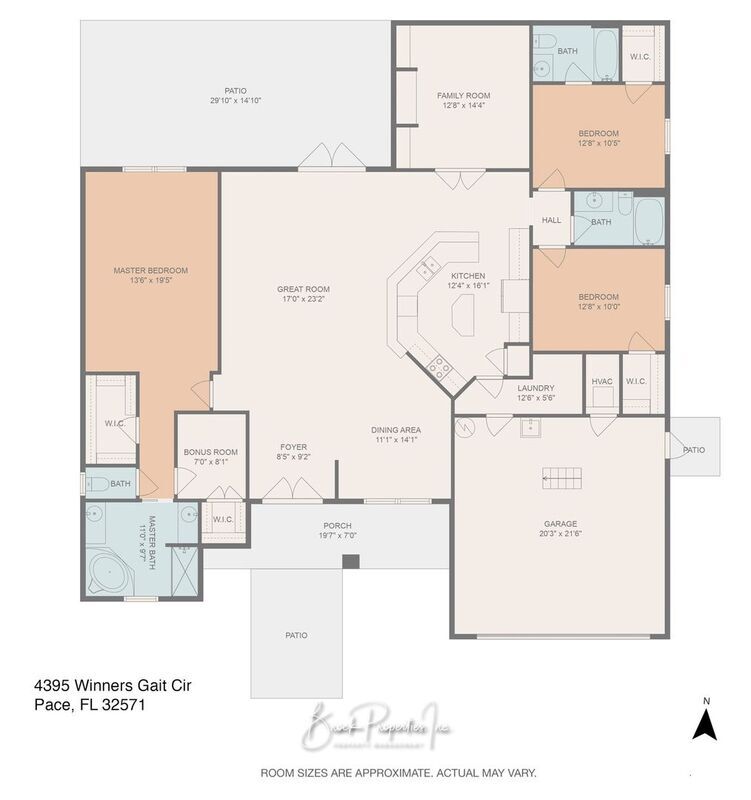 Immaculate red-brick 3/3 with 2,380 sq ft, 2-car garage on a corner lot in the highly sought-after Winners Gait Subdivision in Pace. Featuring real hardwood flooring throughout, with tile bathrooms and laundry. Open kitchen with custom cabinets, granite countertops, stainless appliances, island, and breakfast bar overlooking the great room. Separate dining room and large formal office with custom bookshelves that can double as a family room. The primary ensuite includes two walk-in closets and a versatile office/study or nursery. The primary bathroom has dual vanities, jet tub, and separate shower. There’s a 2nd primary with its own private bathroom and walk-in closet. Amenities include high ceilings, recessed lights, ADT security system, inside laundry, large two-car garage with attic storage, covered front porch, large open patio, privacy fenced backyard, and a sprinkler system, to name a few. Conveniently located in the highly-rated Pace high school zone between Whiting Field and NAS-P. Contact your agent or register with TenantTurner dot com to schedule a self-guided tour at your convenience. FAQ: ***No Roommates***Good Credit (670+)***2-yrs of Rental History or Homeownership Required***Income of 3.25x the rent***ALL adults must apply and qualify - see selection criteria listed on application.***One mature pet under 25-lbs considered after completing the Animal application linked on the last page of the rental application.***$250 pet fee and $20/mo pet rent for semiannual condition inspections.*** For more information and to schedule a self-guided tour, click: or call . Office: 5900 N. 9th Ave., Pensacola, FL 32504. Hours: Mon-Thur 9a-4p, and Fri 9a-12p. Closed weekends and holidays Application Fee: $50 per adult | Leasing Fee: $90 | Term: 12-months Amenities: 2-car garage, Corner lot, Ceiling fans, Granite countertops, Stainless appliances, Privacy fenced backyard, Recessed lighting, Crown molding, Breakfast bar, Sidewalks, Walk-in closet, Covered porch, 10' ceilings, Underground Utilities, Sprinkler system, Additional attic storage, Brick mailbox, Video doorbell, Real hardwood floors, Two primary bedrooms with private bathrooms, ADT security system with monitoring included, Large open patio, Inside laundry room with built in ironing board, Large office or family room with built-in shelving, Kitchen island, Open kitchen overlooking great room, All brick siding
