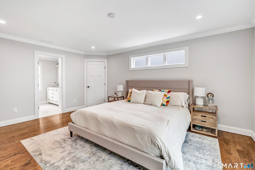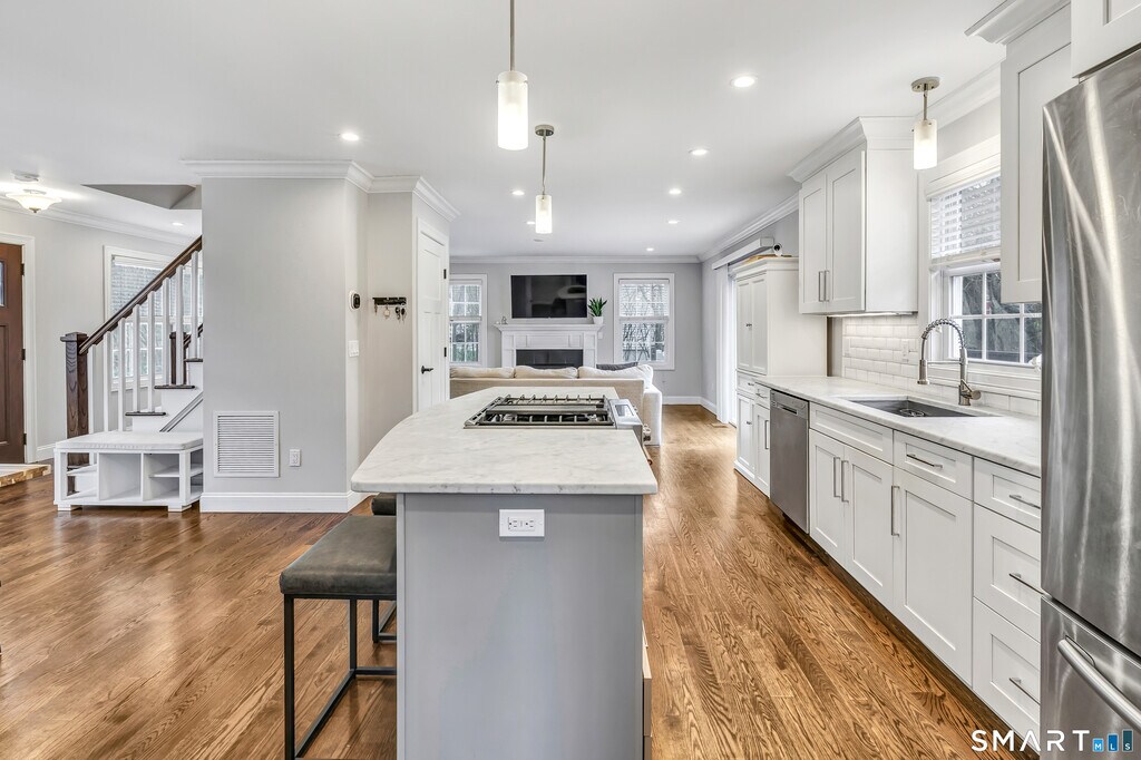 Call for Availability - This beautifully maintained Colonial blends modern updates with timeless style. The bright, open-concept layout features hardwood floors and a seamless flow, perfect for everyday living and entertaining. The kitchen offers custom gray cabinetry, quartz countertops, stainless steel appliances, and a spacious island. A powder room and separate laundry area add convenience. The living room, centered around a gas fireplace, opens to a large deck for easy indoor/outdoor living. The fenced backyard includes thoughtfully placed landscaping that provides seasonal privacy. Upstairs, the primary suite features a full bath with double sinks and a customizable walk-in closet. Two additional bedrooms with ample closet space share a full bath. The partially finished basement provides flexible space for a home office, gym, or playroom. Additional features include central air and smart home technology. Located in desirable Fairfield, close to beaches, shops, restaurants, parks, top-rated schools, and commuter options to NYC, this home offers comfort, convenience, and a great lifestyle. MLS# 24161887