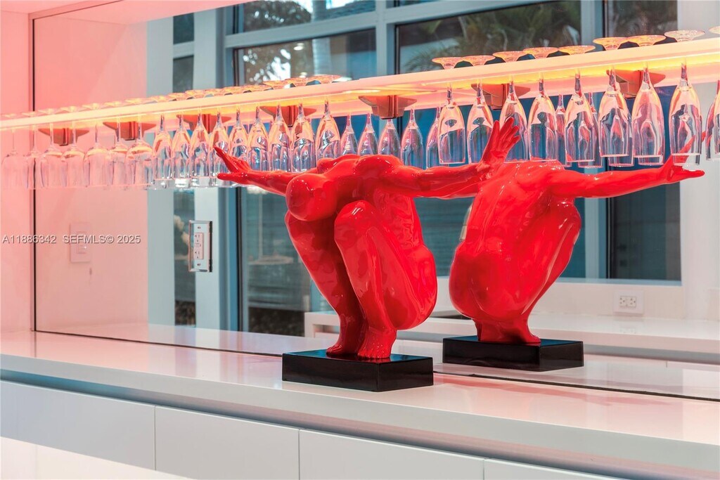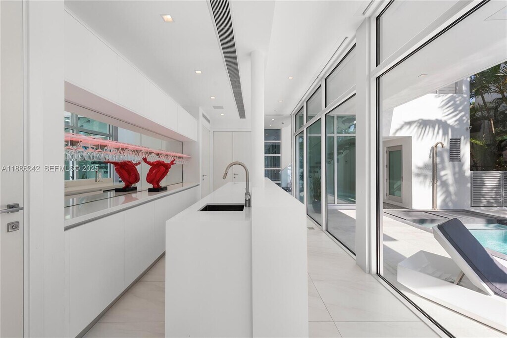 This sleek ultra-modern tri-level waterfront masterpiece sits on the coveted tip of Hibiscus Island. Impeccably designed with exquisite porcelain and oak wood floors, open living, dining and family areas with spectacular unobstructed views to bay and Miami skyline. Gourmet kitchen with top appliances, custom bar, movie theatre with leather recliners, gym and outdoor kitchen. All bedrooms on 2nd floor have balconies with water view. Heated infinity edge lap pool, Jacuzzi with fire pit feature, expansive rooftop lounge with 360 degree views to bay and city, dock/boat lift, 85FT of Waterfront and stunning sunset views complete this home.