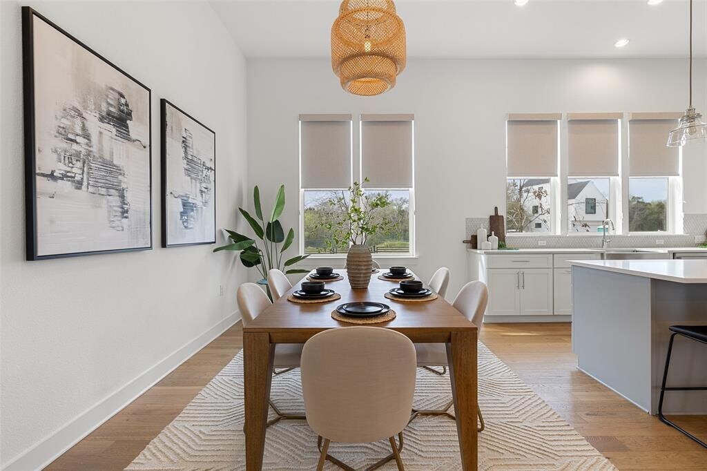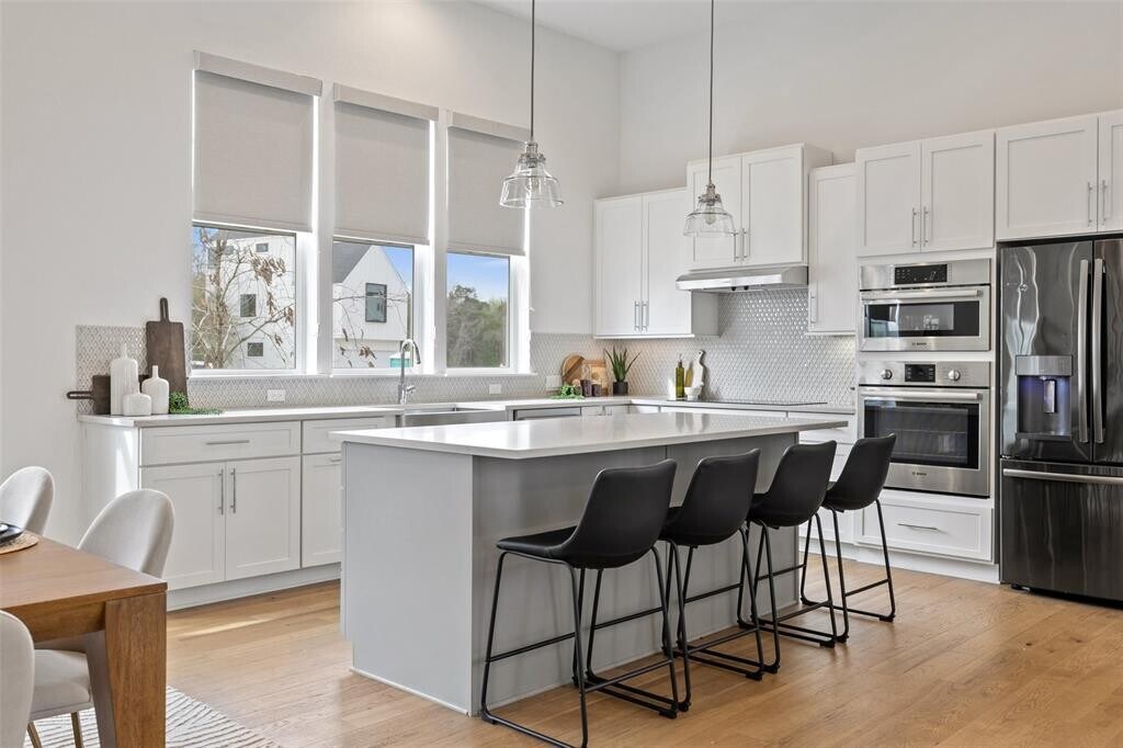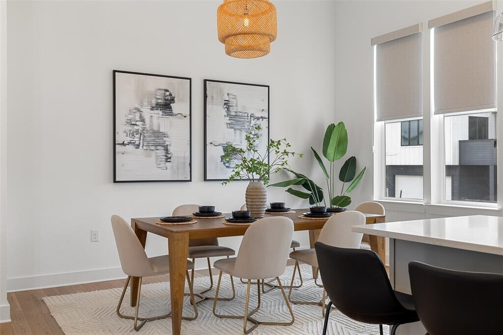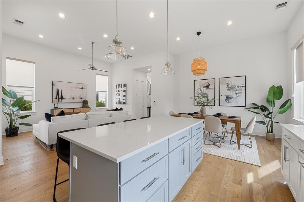 Make-ready in progress. The primary bedroom door will be replaced. Turnkey 4 bed, 3 bath home near Mueller. Upon entry, you are greeted by a bright and airy interior featuring an open floor plan with high ceilings, wood floors, and modern fixtures. The kitchen offers a large center island overlooking the living and dining area, perfect for entertaining. It is equipped with quartz countertops and stainless steel appliances including a built-in oven and cooktop. A bedroom on the main floor is perfect for guests or a home office space. Upstairs, a second living area offers the ideal space for game or movie nights. The primary suite is a private retreat featuring high ceilings, a generous walk-in closet, and a spa-like en suite bath with double vanity, glass-framed walk-in shower, and soaking tub. Two additional bedrooms upstairs are generously sized. Situated in a charming neighborhood and next door to the community greenspace. With an end-unit, you enjoy added privacy with neighbors only to one side. Spend your weekend shopping or enjoying a bite to eat in Mueller or play a round of golf at Morris Williams Municipal Golf Course nearby.