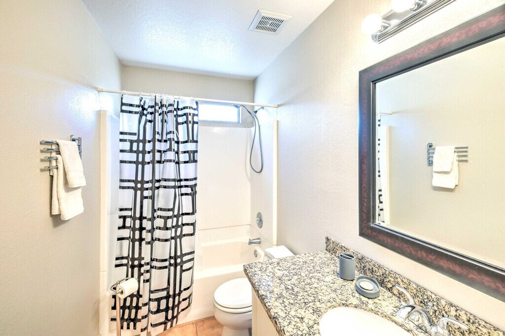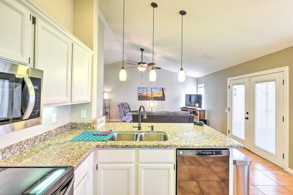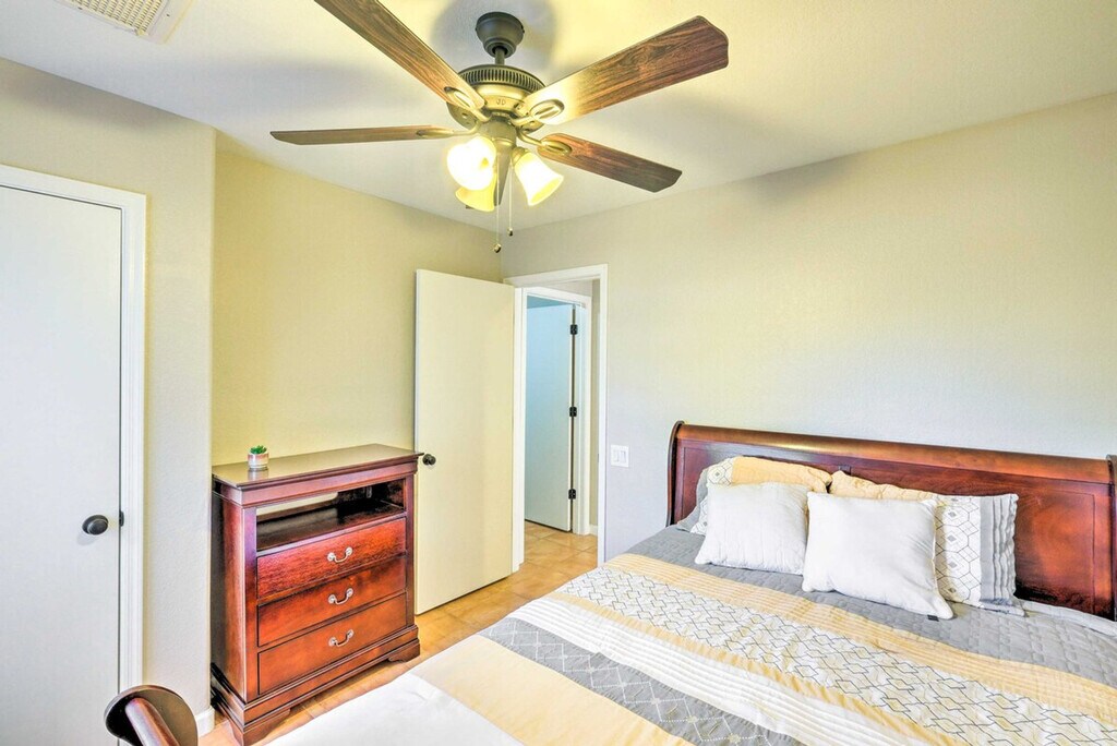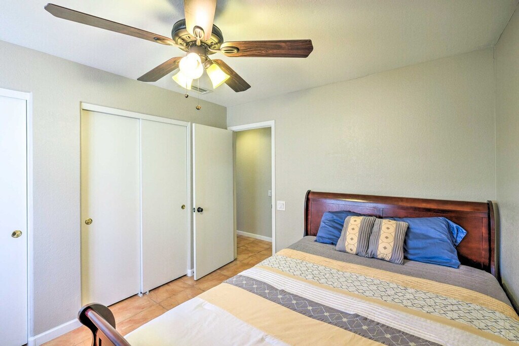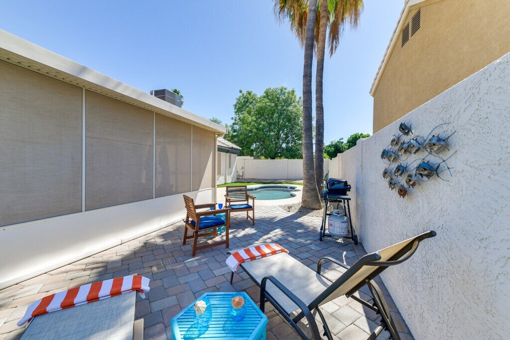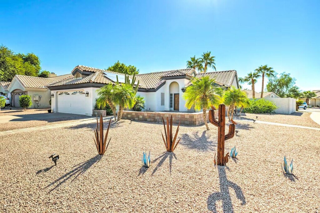 Feel at home in this fun-filled 3-bedroom, 2-bath Gilbert vacation rental, boasting a bright interior and all the necessary comforts for quality time with your loved ones. This home features a fenced yard, a heated outdoor pool (depth 3.5’-5’), a patio with outdoor seating, an enclosed sun room, and a gas grill. Inside, you'll find cable TVs, arcade games, a poker table, and a dining table. The kitchen is equipped with a fridge, stove/oven, dishwasher, cooking basics, a toaster, and a breakfast bar with seating. Additional amenities include free 5G Wi-Fi, central air conditioning and heating, linens/towels, complimentary toiletries, a washer and dryer, keyless entry, and an iron/ironing board. Pets are welcome with a fee paid pre-trip. Experience the area's highlights by playing golf on nearby courses, stopping by the Gilbert Farmers Market, or visiting attractions like the Phoenix Zoo. Parking is available in the driveway for 2 vehicles, with free street parking available on a first-come, first-served basis. [SI]