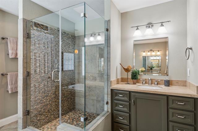 MOVE-IN READY! Luxury Custom 1.5 Story Home with Exceptional Character. NEW Interior Paint and Carpet. Fridge Included! Step into a light-filled entry with elegant craftsman parquet floors, which continue into the formal dining room featuring a classic tray ceiling. The spacious living area boasts new Berber carpet, a cozy brick fireplace, and custom built-ins that add warmth and character. The unique rotunda breakfast nook is a true standout, with built-in cabinetry and large windows offering peaceful views of the sparkling pool and spa—perfect for enjoying your morning coffee. The updated kitchen is a chef’s dream, complete with granite countertops, updated cabinets, a skylight, double ovens, and stainless steel appliances. The private primary suite is a serene retreat, offering a generous ensuite with double vanity sinks, a separate custom stone tiled shower, and a garden-style jetted tub for the ultimate in spa relaxation. With five bedrooms, this home provides plenty of flexibility—use the fifth bedroom as a study, home office, or mother-in-law suite. In additional there is a Game room upstairs with half bath--perfect for a pool table, play area, home business, or movie nights. Step outside to your covered patio overlooking the sparkling diving pool and spa—a private backyard oasis, complete with an herb garden and high-quality privacy fence. (Note: Pool and spa are not heated.) $125 monthly pool cleaning fee required. Enjoy all that Bent Tree West has to offer, including the nearby Swim & Tennis Center with social events, tennis and pickleball courts, a park, clubhouse, and a great sense of community. This is a rare opportunity to own a home with incredible value in one of North Dallas' most desirable neighborhoods. Come see it today and imagine the possibilities!