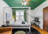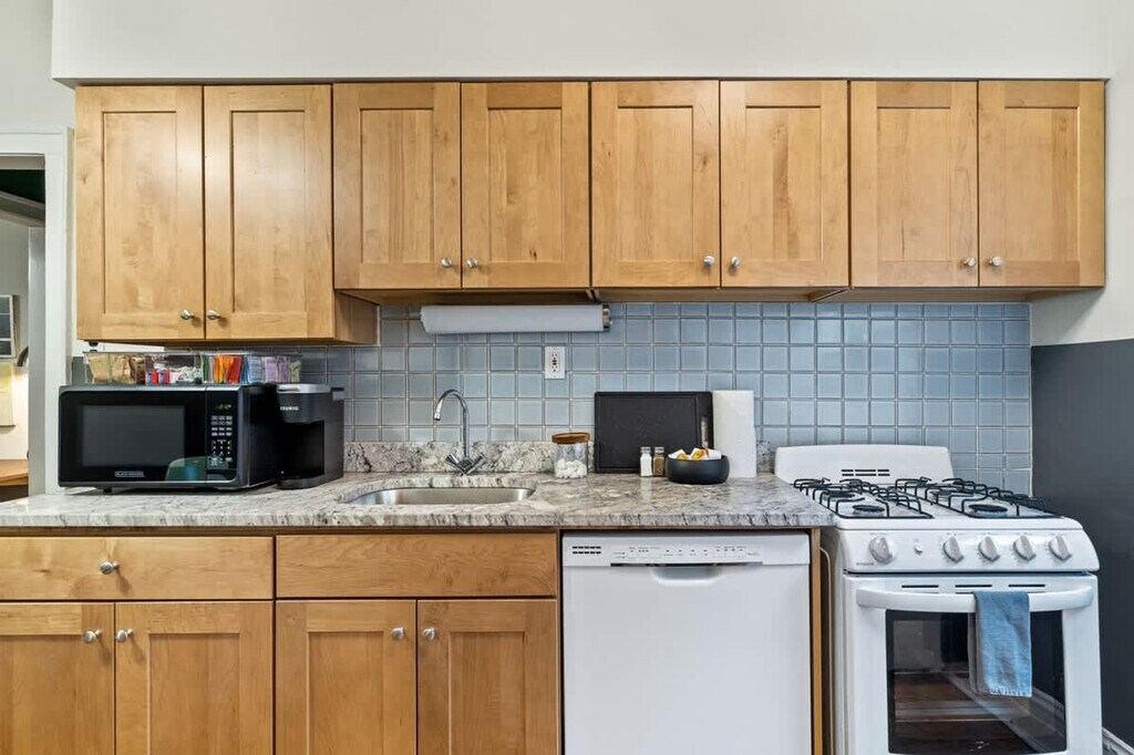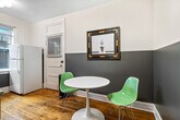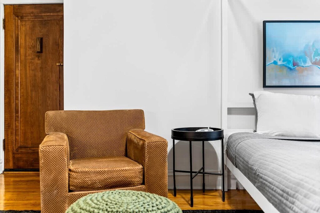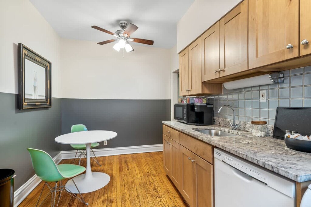 Feel at home in this perfectly nice little apartment on a beautiful street, located up one flight of stairs. The apartment may present a challenge to anyone with limited mobility. This apartment includes high thread count cotton sheets, comfortable feather pillows, great mattresses, and thick towels. Bath products are from Public Goods. The kitchen is quite large and the sleeping area includes a desk. During your stay, you receive a free membership to The Metropolitan, a members-only club and co-working space located on the 66th and 67th floors of the Willis Tower (for reservations less than 14 days only). This includes an upscale co-working space, dining, bars, and stunning views of Chicago and Lake Michigan. A parking spot isn't included. There's free street parking on the block and most residential blocks nearby except between 5-10pm on Cubs game nights and when there are special events at Wrigley Field. It is recommended to use a service called SpotHero to reserve a spot nearby before you arrive. Although shops and restaurants are nearby, the area feels peaceful and secluded. The brown line train is about a 10-minute walk down Montrose Avenue, with trains running into the heart of the city and easy transfers to the subway service. The Clark Street bus, which goes down into the Wrigleyville area, is immediately beside the apartment. Within a three-minute walk are some great takeaway food spots and a 7-Eleven. The area centered around the Montrose CTA stop has three or four lovely spots to eat and a couple of great bars. Wrigley Field is about a 20-minute walk down Clark Street. The boiler that provides heat and hot water for the whole building is located one floor below the apartment, and some vibrations can carry into the unit at times as it works away. There is no smoking of any kind in the unit, and there will be an automatic $500 cleaning fee if there is any smoke smell inside of the unit. Quiet hours are from 10PM to 8AM. There is an automatic $100 late check-out charge if you're still in the property 20 minutes after check-out. There is a $45 fee if you lock yourself out or lose your key. [SI]