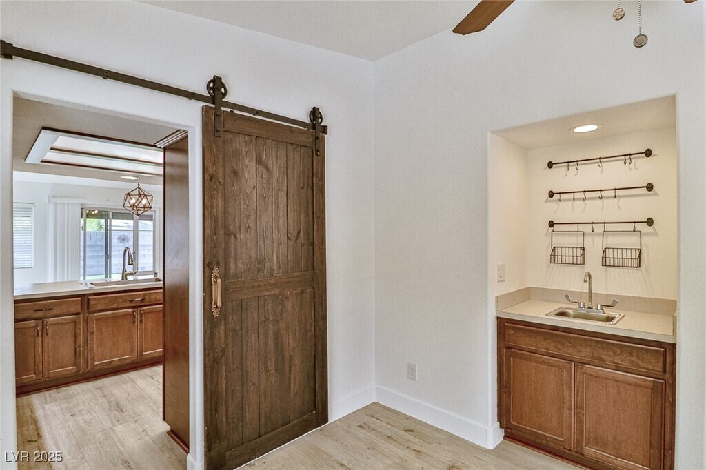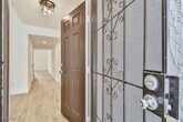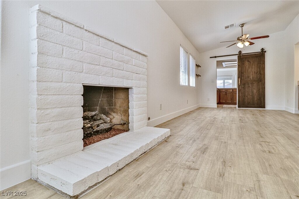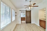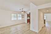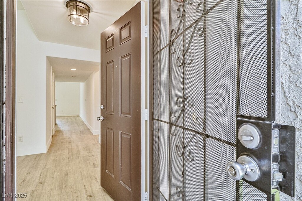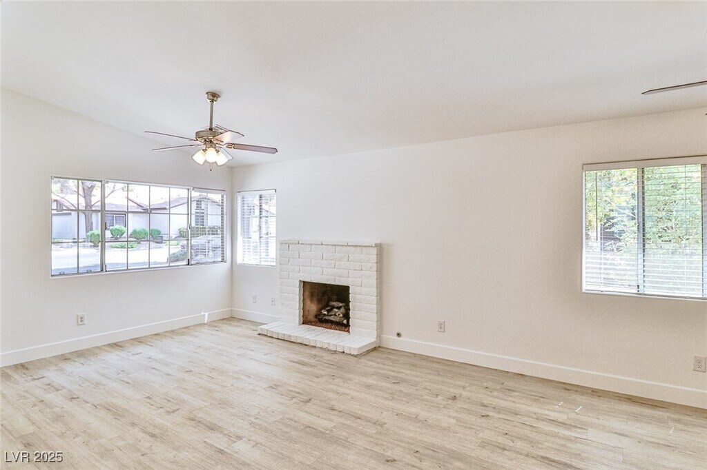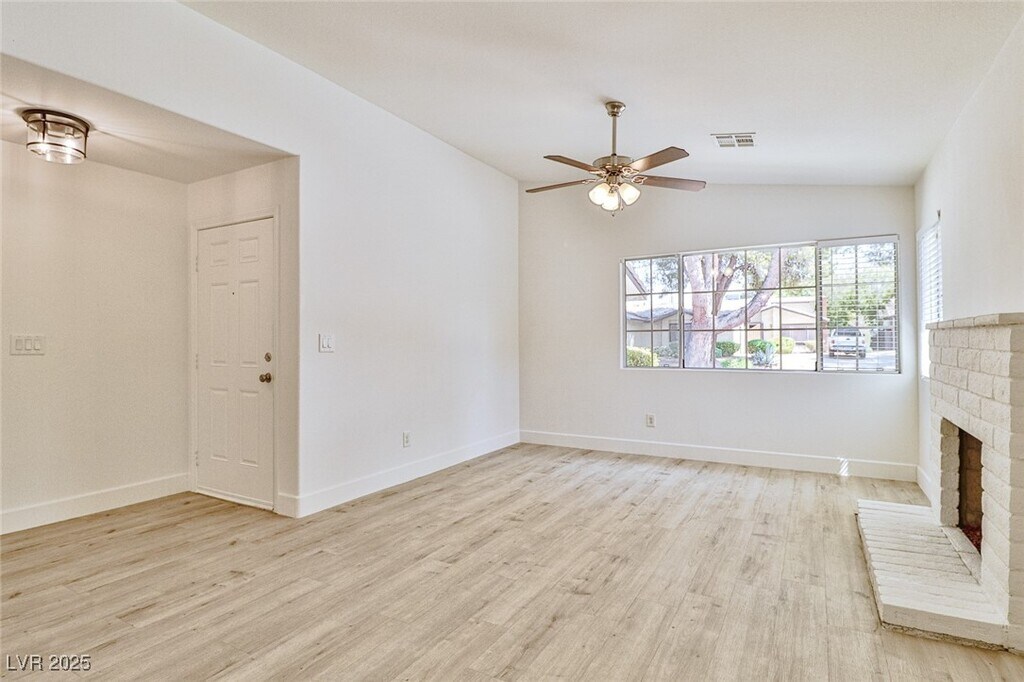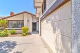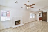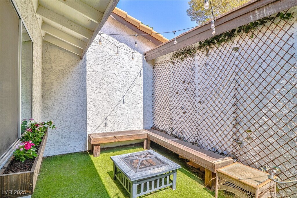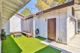 Discover comfort & convenience in this beautifully upgraded 2-bedroom, single-story townhome with a spacious 2-car garage. The open living area features a cozy fireplace & stylish vinyl plank flooring that extends through the common areas. The kitchen is designed with stainless steel appliances, a decorative backsplash, and contemporary finishes—perfect for cooking and entertaining. A built-in bar area adds a unique touch for hosting guests. The primary suite is a private retreat with a walk-in closet and abundant natural light. The second bedroom has been thoughtfully expanded by combining two rooms into one oversized space, making it ideal as a guest suite, home office, or flex room. Step outside to a beautifully landscaped backyard designed for easy upkeep, featuring lush artificial turf and stately palm trees. Set within a gated community featuring a refreshing pool, this home offers quick access to The Strip, local coffee shops, grocery stores, and popular dining spots.