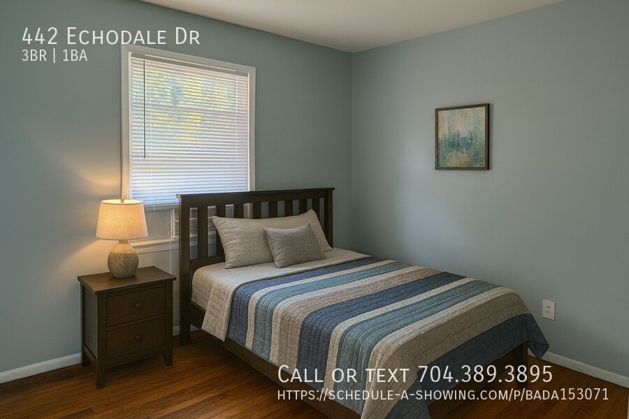 Welcome to 442 Echodale Drive, a freshly painted 3-bedroom, 1-bath home located on a spacious corner lot in Charlotte. This property features hardwood floors, tile in the kitchen, great layout giving it. Perfectly situated near I-77, this home offers convenient access to Uptown Charlotte, South Charlotte, and Nations Ford, making commuting a breeze. Key Features: - 3 spacious bedrooms, 1 full bath - Hardwood flooring throughout living areas - Tile flooring in the kitchen - Freshly painted interiors and updated bath - Corner lot with added privacy and curb appeal - Excellent location near I-77 and major Charlotte destinations Lease Terms: - First month’s rent and security deposit required at move-in. This home combines comfort, location, and value — ideal for those looking to be close to everything Charlotte has to offer. Some images digitally enhanced for marketing. Furniture has been digitally staged.