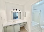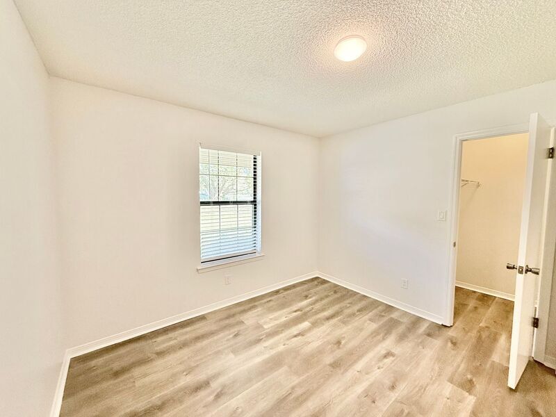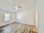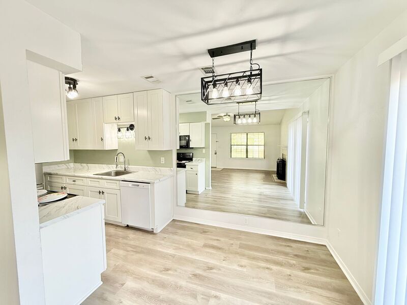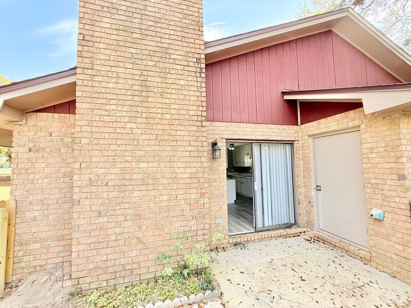 View In 3D: This well-maintained quadplex unit offers low-maintenance living with luxury vinyl plank flooring throughout and water, sewer, and sanitation included in the monthly rent. The well-appointed living room features a tiled fireplace and opens seamlessly into the kitchen and dining area. The galley-style kitchen showcases crisp white cabinetry, ample counter space, and a single-basin sink, along with all major appliances including a refrigerator with bottom freezer drawer, built-in microwave, range/oven, and dishwasher. Just off the kitchen, the dining area is accented by a large decorative mirror and provides direct access to the private backyard. The spacious primary bedroom includes an ensuite bathroom with a unique single vanity with seating area and a tub/shower combo. The second bedroom is also generously sized and features a large walk-in closet. A second full bathroom offers a single vanity with updated fixtures and a tub/shower combo. Additional highlights include a spacious laundry room with storage shelving and a full-size washer and dryer provided, as well as a private, fully fenced backyard.