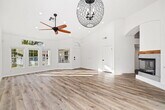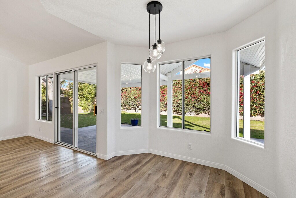 Welcome to this chic desert abode located in the highly sought-after La Quinta Vistas neighborhood. Upon entry,you're greeted by a bright open-concept living and dining area featuring luxury wood-like vinyl flooring and stylish modern lighting throughout. An inviting ambient fireplace subtly separates the living space from the family room,which opens to a well-appointed kitchen with contemporary gray cabinetry,newer stainless steel appliances,and a cozy breakfast nook,perfect for enjoying your morning coffee. The home offers four spacious bedrooms with plush newer carpeting and two tastefully updated bathrooms. The primary suite features dual sinks,a soaking tub,and a walk-in closet for added comfort and convenience. Step outside to an expansive backyard with mature landscaping,ideal for entertaining,complete with a built-in BBQ. Additional highlights include a two-car garage and a laundry room equipped with a newer washer and dryer. Ideally located near shopping,popular restaurants,golf courses,and highly rated schools,this home offers the perfect blend of comfort,style,and convenience.