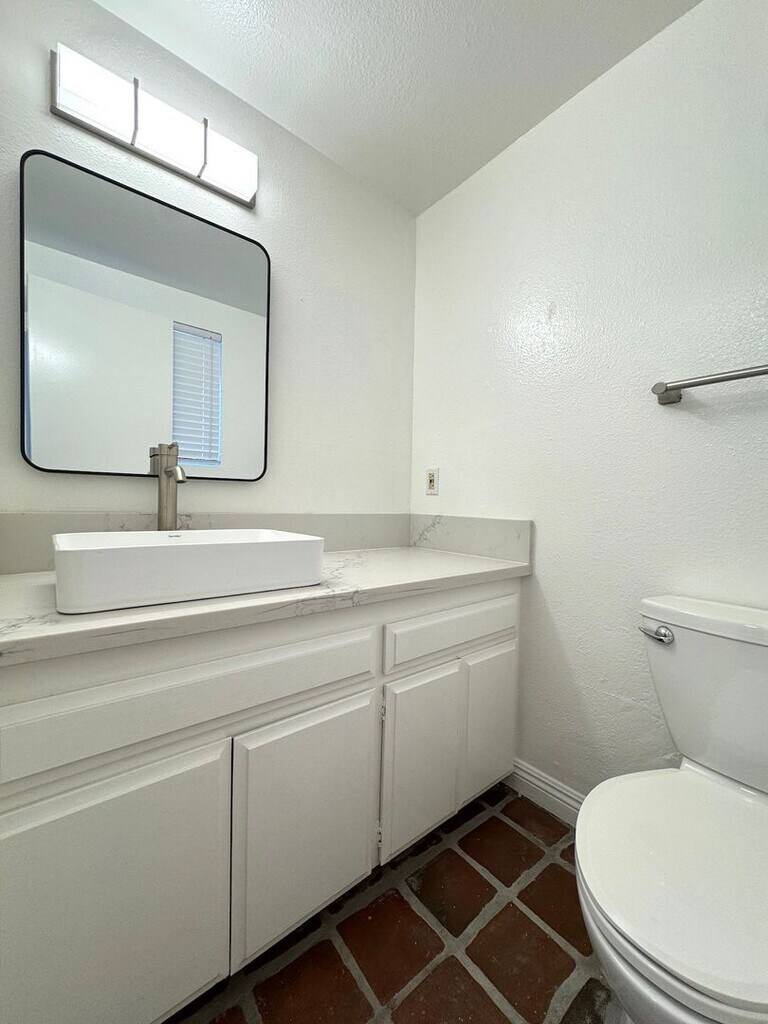 Two-story layout, Tile and laminate flooring throughout, Kitchen with breakfast bar, updated countertops, stove, and dishwasher, Bathrooms with updated countertops, Laundry hookups (ventless dryer only), Central A/C and heat, Detached 2-car garage, Spacious backyard, Available immediately