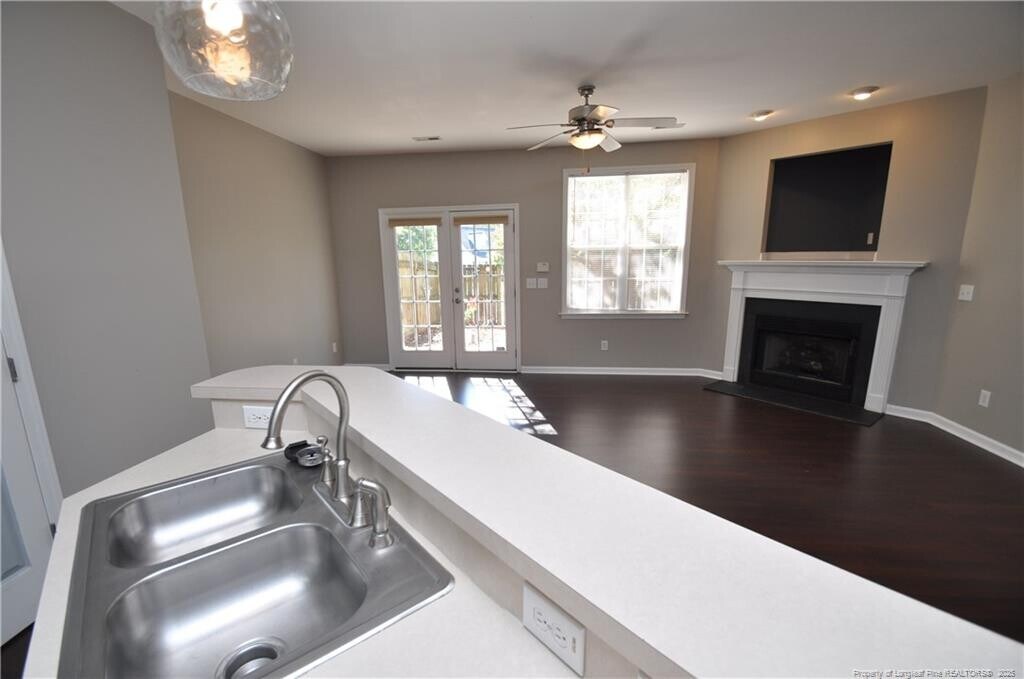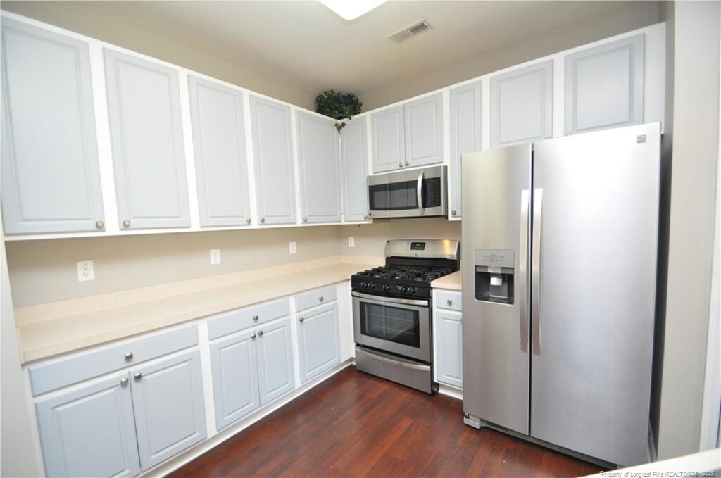This gorgeous North Raleigh townhome lives like a single family home and is sure to please! Its immaculate interior exudes a feeling of spaciousness that must be seen to be believed. A covered front porch welcomes you inside where you'll appreciate the dark laminate floors that stretch throughout the first floor; these are both beautiful as well as low maintenance. The foyer opens on one side to a study/den with an arched entry, double windows and a very neat triple bulb fixture with an adjustable height feature. Head down the hallway where you're greeted by an expansive kitchen, family room, and dining area. The kitchen serves as the center of the living space and it includes custom painted cabinetry, a pantry, sleek stainless appliances (including a gas oven) and a huge island with a breakfast bar, pendant lighting and a double bowl stainless sink. This open concept design works perfectly for both entertaining as well as today's more casual lifestyle. An adjacent dining area seamlessly transitions into the family room and kitchen; it's also perfectly-proportioned. The family room features recessed can lighting, a light/fan combo, a cozy gas log fireplace, double windows and a TV niche. Before heading upstairs be sure to visit the outdoor living space - 4439 Golden Moss Path also offers the very rare luxury of a fenced-in, private backyard area complete with a patio, a shade tree, storage closet and a path that leads to the two reserved parking spaces behind the home. Take a quick trip upstairs and you'll find all three bedrooms as well as a very conveniently-located 2nd floor laundry center; with a washer and dryer included for resident's use! No more lugging laundry up and down the stairs. The primary bedroom is quite spacious and it includes a walk-in closet as well as double windows and a private, luxury bathroom with a garden tub, an elevated vanity with dual sinks, and a separate walk-in shower. Bedrooms #2 and #3 both include double wall closets as well as double picture windows with a custom-built sitting bench; offering the perfect place to catch up on homework or read a book!