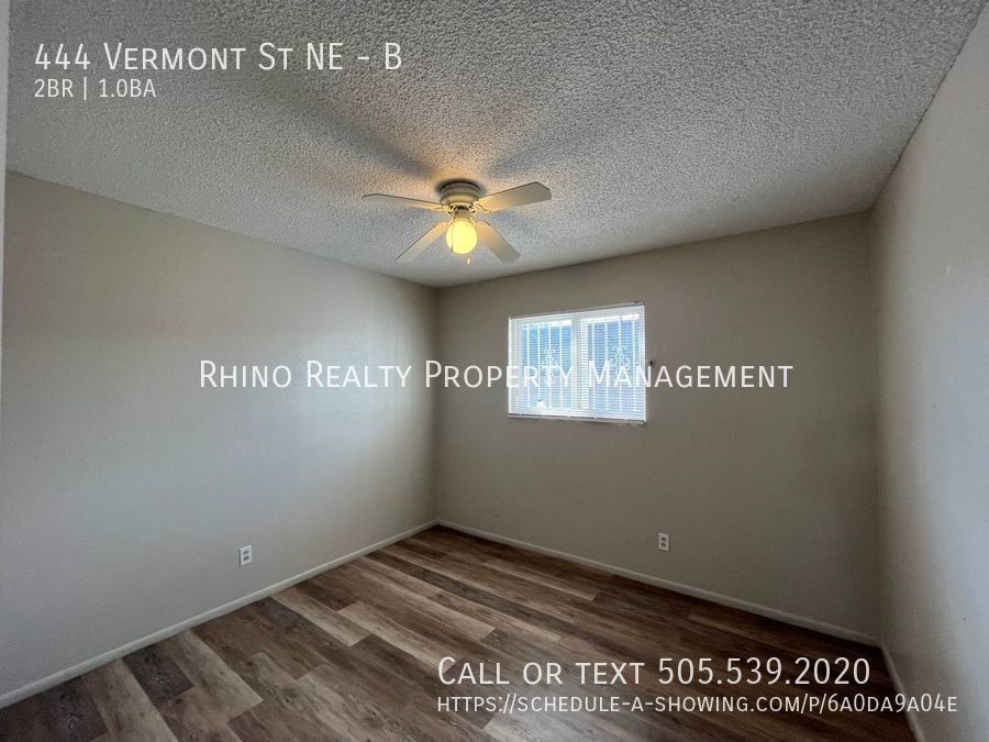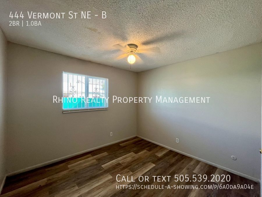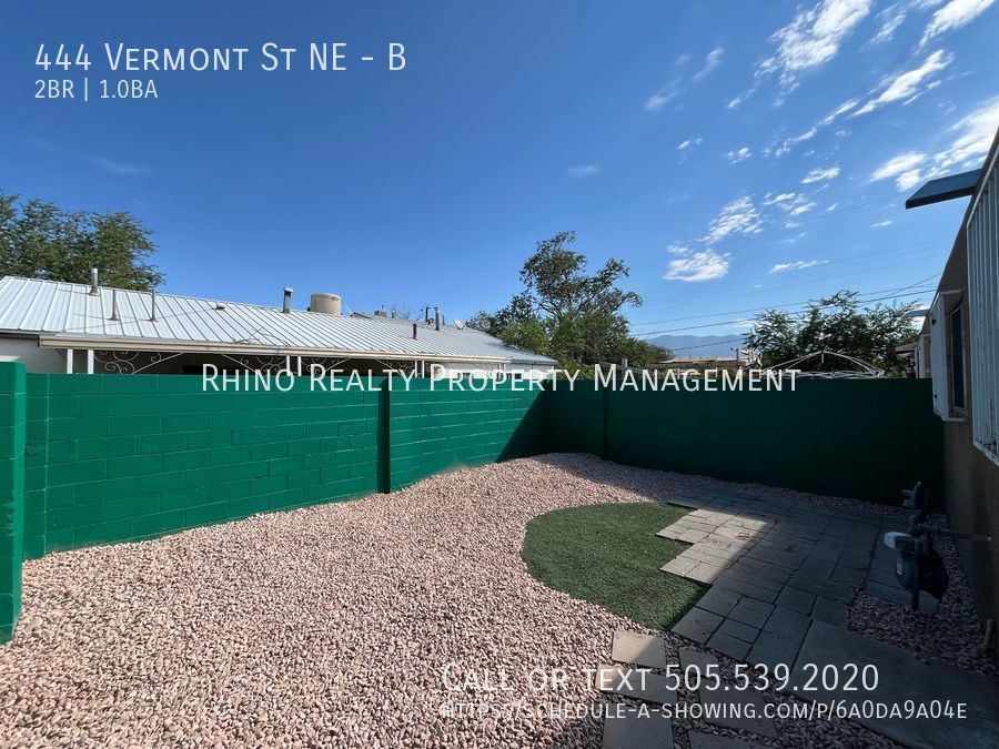 Discover your new home at 444 Vermont St NE! This charming 2-bedroom, 1-bathroom apartment is perfectly situated in the desirable Northeast area of Albuquerque. Offering a blend of comfort and convenience! This rental is ideal for anyone looking for a cozy place to call home. Please call to schedule a viewing! Or press the "Schedule a Showing" button on the property page! Utilities: PNM & NM Gas in resident's name. Residents pay flat rate water/sewer $40/mo Pet Policy: Cats and Small Dogs 30 pounds or less $30 Pet rent $300 Pet fee, nonrefundable Limit of two pets Vehicle/Parking Policy: Limit 1 Vehicle Assigned Please call to schedule a viewing! Or press the "Schedule a Showing" button on the property page! None.