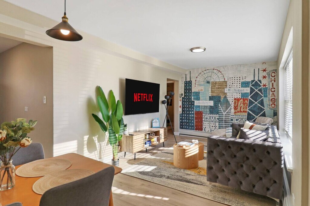 Feel at home in this stylish 2-bedroom condo, thoughtfully designed to provide an authentic Windy City experience. The apartment is located just 20 minutes from downtown Chicago and 15 minutes from Midway Airport. This condo is perfectly suited for business travelers or a group trip and features a fully stocked kitchen, a Keurig coffee maker, and several board games for your enjoyment. Other notable amenities include attached laundry facilities, fully stocked bathrooms, noise machines, a hair dryer, and an iron with board. The stylish living room includes a smart TV, a comfortable couch and chaise to unwind, and several curated board games for your entertainment. Free reserved parking is available for one car on the premises, and additional parking can be accommodated. Free laundry credits are provided for guests to use the laundry machines. Nestled in Stickney, IL, enjoy the best of both worlds with close proximity to downtown Chicago (20-minute drive) and the convenience of Midway Airport (15-minute drive). You'll also have easy access to public transportation, as the apartment is 7 minutes from Harlem Metra station and a few blocks from the CTA bus stop, providing a short ride to downtown Chicago. Numerous grocery stores, cafes, restaurants, and city attractions are within a short drive. Please respect the neighbors by keeping noise to a reasonable level. Strictly no partying is allowed at any time, which is strictly monitored and will result in a $500 fine and immediate removal. No community disturbances are allowed at any time, which is subject to immediate removal. Strictly no smoking is allowed in or directly outside the unit, which will result in a $500 fine. Please take care of the furniture and items in the unit, as there is a strict damage policy for furniture items, by item. Check-in time is 4:00 pm, and checkout time is 11:00 am. Includes a dedicated workspace with high-speed Wi-Fi. [SI]