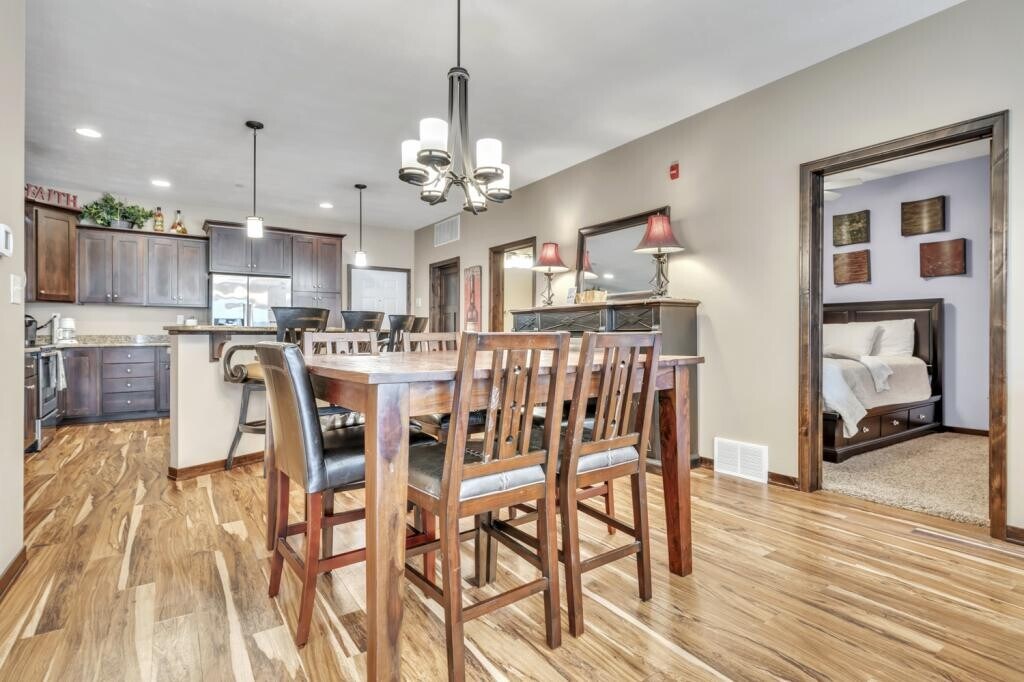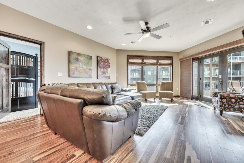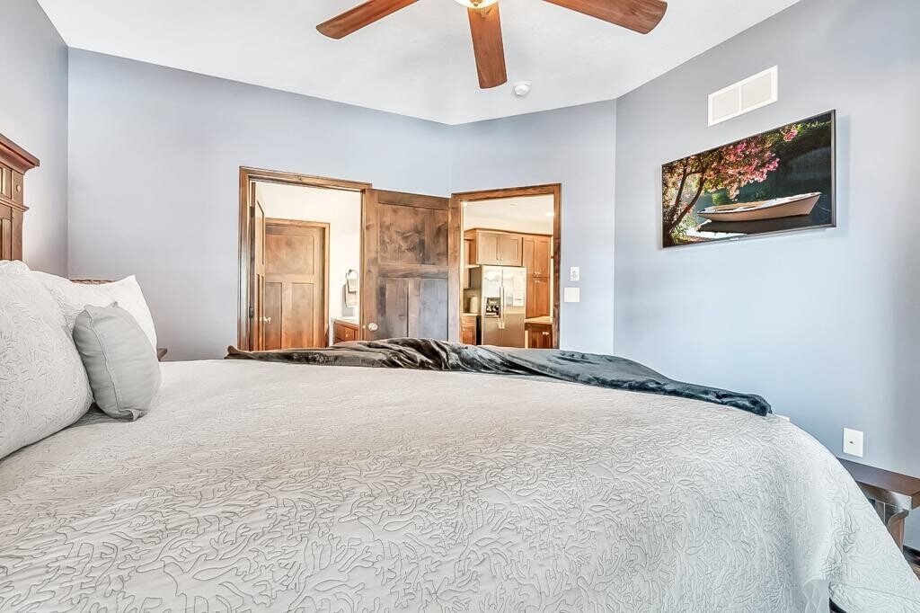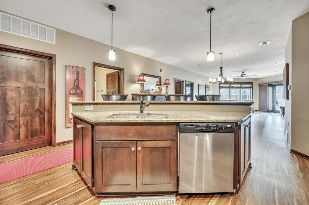 Bedding Summary: Master bedroom: King bed Guest bedroom 2: Full over full bunk bed; Twin over Twin bunk bed Guest bedroom 3: King bed This poolside unit is 3-bedroom 2 bath condo sleeps 10, with East Lake (and pool side) views from patio. Your home away from home offers full size kitchen appliances, small appliances such as a toaster, blender, and coffee maker (coffee not furnished) and one cup Keurig (pods not furnished) are available for your use. Breakfast bar with 4 stools on the kitchen island and the dining table seats four. This is a main level condo, so you are steps from the outdoor pool, you have plenty of room for yard games and to let the kids run around. Spacious private deck with an outdoor table that seat six and a gas grill. Living room offers lots of light from the high windows, leather furniture, gas fireplace, wireless internet and is open to the kitchen and dining areas. Master bedroom offers a king size bed with full on suite with separate shower, dual vanity and walk in closet. This property is professional hosted by Okoboji Property Management.