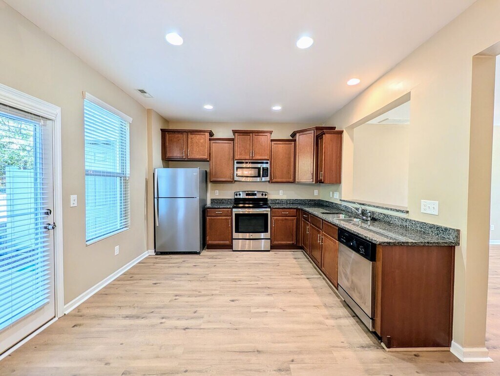 Welcome to this beautifully maintained 2-story townhome that perfectly blends comfort, style, and convenience! Enjoy a charming covered front porch and a private rear patio—ideal spots to relax with your morning coffee or unwind in the evening. Inside, you’ll find a spacious open-concept living and dining area with brand new LVP flooring on the main level and new carpet upstairs. The modern kitchen features plenty of cabinetry, sleek granite countertops, and stainless steel appliances. The large primary suite includes a walk-in closet and a private bath with a stand-up shower. Additional features include a rear-attached storage closet for extra space. Located right on the Raleigh/Wake Forest border, this home offers quick access to shopping, dining, and parks—everything you need just minutes away!