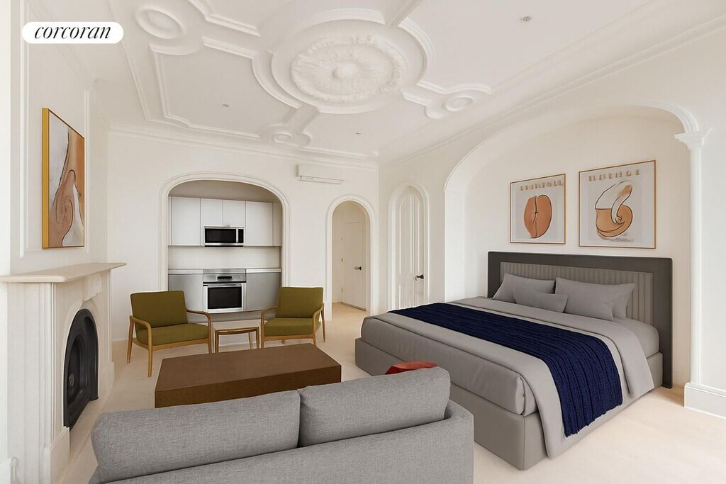 Oversized, Newly Renovated Studio with Large Private Terrace and In-unit washer/dryer at Gable House! Available for a 6-month lease only, unfurnished or furnished. Please inquire for more information.This oversized, fully renovated studio offers a rare combination of scale, charm, and modern comfort-all within a boutique pre-war setting. Step inside to soaring 11-foot ceilings, a handsome decorative fireplace, and a thoughtfully redesigned layout that maximizes space and light. The expansive living area flows effortlessly onto a large private terrace-your own outdoor escape in the city.The sleek new kitchen is equipped with high end appliances, custom cabinetry, and refined finishes-ideal for everything from casual meals to hosting al fresco on the terrace. An in-unit washer/dryer adds to the everyday convenience. Central A/C throughout. Wi-Fi also included.The spa-inspired bathroom features radiant heated floors and a state-of-the-art filtered water system that even extends to the shower-offering a luxurious, wellness-forward retreat.Modern conveniences include keyless entry for both the unit and building, plus an optional intercom app for remote guest and package access.Set on a peaceful block of West 51st Street, Gable House is a boutique pre-war gem offering elegant finishes, distinctive charm, and a fresh take on West Side living-just moments from Manhattan's top dining, culture, and entertainment.Pets considered on a case-by-case basis.Gable House- historic beauty, modern luxury, and private outdoor living in one extraordinary home.Photos are virtually staged with furniture similar to what will be provided if the unit is rented as furnished.Fees:$20 Application fee per applicant$500 refundable move-in/move out deposit