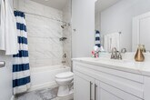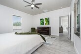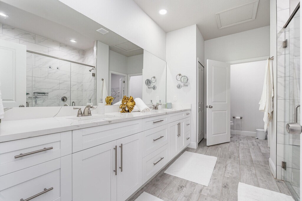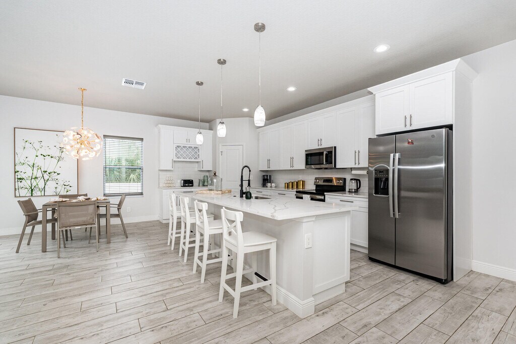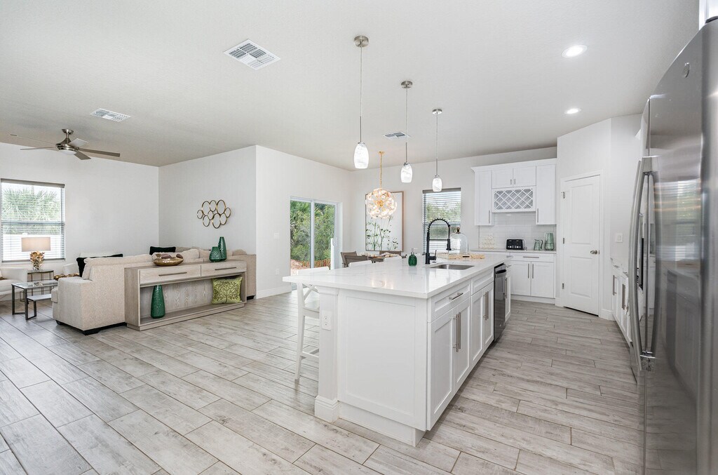 Beautiful 4-bedroom,2-bath modern home featuring high-end finishes and an open-concept floor plan. Interior offers 10-foot ceilings and wood-plank tile flooring throughout. The kitchen includes white cabinetry with wine rack,quartz countertops,and stainless steel appliances,with pendant and recessed lighting providing a bright,open feel. The primary suite features a large walk-in shower with glass enclosure and dual shower heads,double sinks,and ample counter space. Both bathrooms include custom vanities and quartz countertops. Spacious walk-in closet with access from both the bedroom and bathroom. Additional features include impact windows and doors,new metal roof,new A/C,and new vinyl fence with gated access. Property shows like a model home. MLS ID R11153833