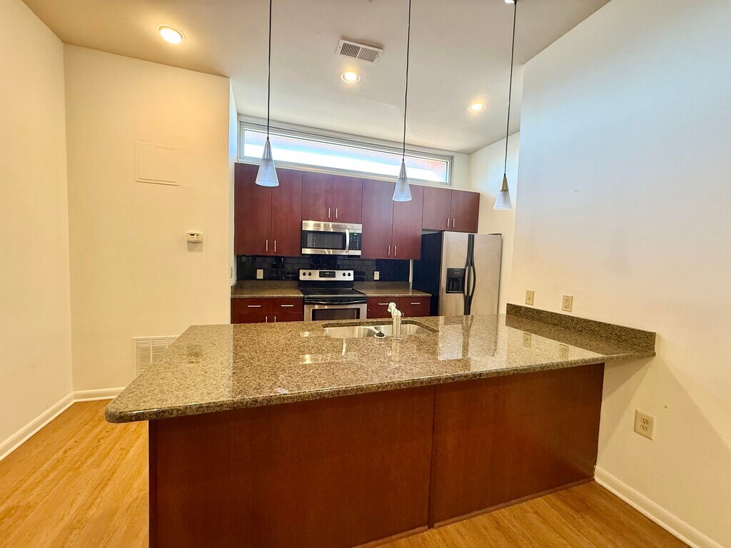 This 3 story 2 bed, 2.5 bath condo located in the Edge At Monroe is a must see! The large garage and storage area is on the basement level with secure gated and guest parking. On the ground floor level is the beautiful contemporary/light industrial living room and kitchen with a half bath. The kitchen comes with all stainless steel appliances. On the upper floor are 2 bedrooms with en-suite baths and the laundry. The largest primary room has a small balcony. All residents must qualify. Please call to schedule an appointment. Restaurants and Breweries are in walking distance! Available Immediately. MLS# 10216516