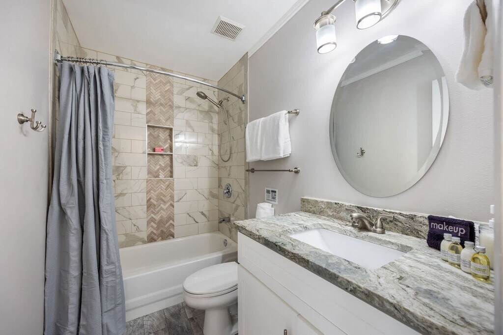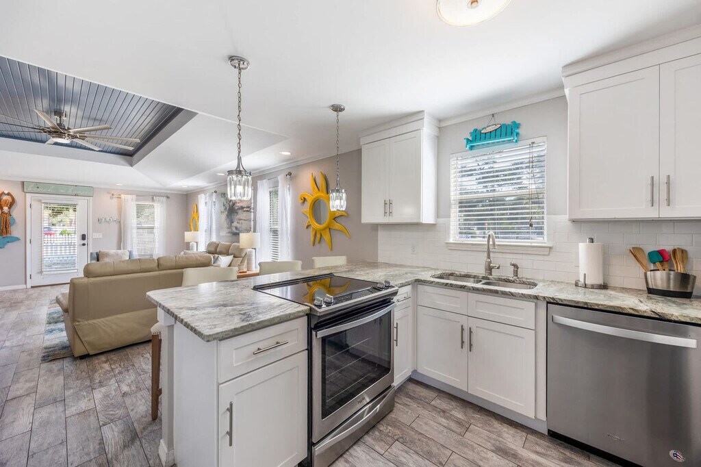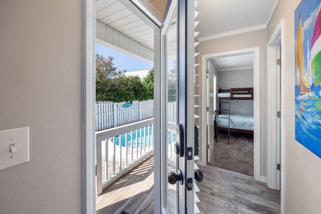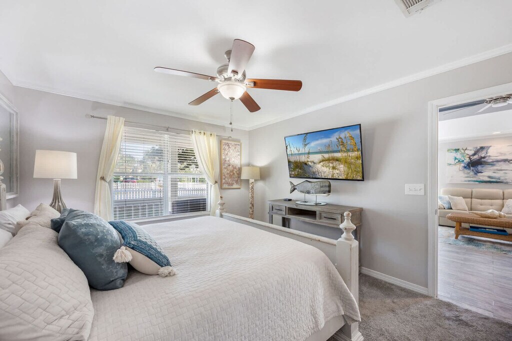 Feel at home in Emerald Escape, a single-level 3-bedroom, 3-bathroom home perfectly situated in the heart of Crystal Beach, just minutes away from the beach. This home offers bright and spacious living areas and an attached bedroom with its own private entry. This home features a fully equipped kitchen, smart TVs, high-speed Wi-Fi, a washer/dryer, and keyless entry. The kitchen is stocked with a fridge, dishwasher, range, microwave, dishes, cutlery, pots and pans, a crock pot, blender, toaster, and griddle. Bedroom 1 features a king-size bed and a large smart TV with standard cable, including a private en-suite bathroom with a stand-up shower, a full-length mirror, and a spacious closet. Bedroom 2 features two twin-over-queen bunk beds, a large smart TV with standard cable, a closet, and a dresser. Bedroom 3 features a king-size bed, a large smart TV with standard cable, an en-suite bathroom with a stand-up shower, and a mini-split AC unit. An optional 6-passenger golf cart is available to rent. We are pet friendly and allow up to 2 pets with a required, non-refundable pet fee. Located in the desirable Crystal Beach neighborhood, this home is just a few blocks away from the beach. It is conveniently located 20-30 minutes from the airport and 15 minutes from major entertainment venues such as The Boardwalk, SanDestin, Baytowne Wharf, Destin Commons, and Silver Sands Outlets. You will also be within cruising distance to the Scenic Hwy. 30A and many other Destin hotspots. House parties and excessive noise/disturbances after 10 pm are not permitted. Absolutely no street parking is allowed at any time; a maximum of 4 vehicles are allowed in the driveway only. Guests are expected to clean up after their pet, or an additional $50 fee will be assessed. We do not host groups under 25 years of age at any time. [SI]