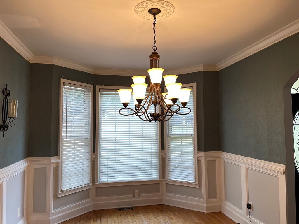 This beautiful 5 bedroom 3.5 bath has impressive two-story foyer with hardwood floors throughout main level. Spacious formal dining has bay windows. Family room has fireplace with vaulted ceilings. The kitchen features stainless steel appliances, ample cabinets and granite countertops. Breakfast area overlooks the fenced backyard. Main level primary suite has trey ceiling with ceiling fan. Primary ensuite bath features a soaking tub, separate tiled shower, water closet, double vanities and walk-in closet. The upper level has three spacious bedrooms and a full hall bath. Full finished basement features family/den with built in bookcases, water bar with mini fridge. The 5th bedroom currently used as a theater room (screen and projector can be purchased if tenant wants to keep as is) additional flex space can be used as office or crafting space with large unfinished storage. Second flex space would be a great game room has a full bath with shower and access to large screened patio. Beautifully landscaped backyard has large raised deck perfect for entertaining. Pear trees, heavy producing peach tree, wine grapes and raised garden beds are some of the things you can enjoy while living here. Pets welcomed with non refundable fee. Breed, size and limit apply. Lawn maintenance availability for an additional $200 monthly, if desired.