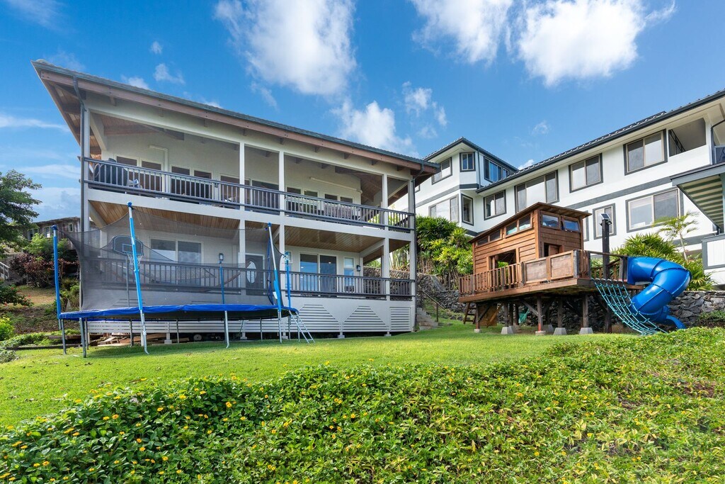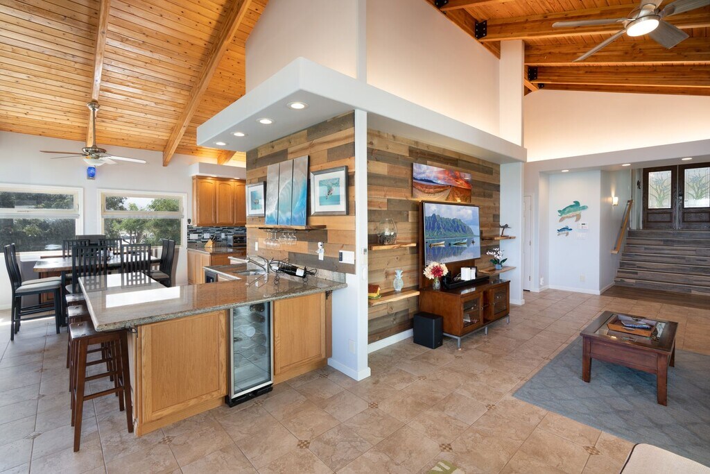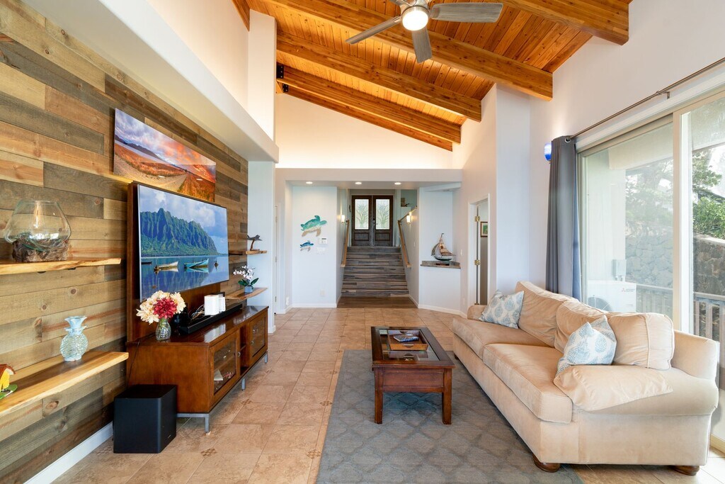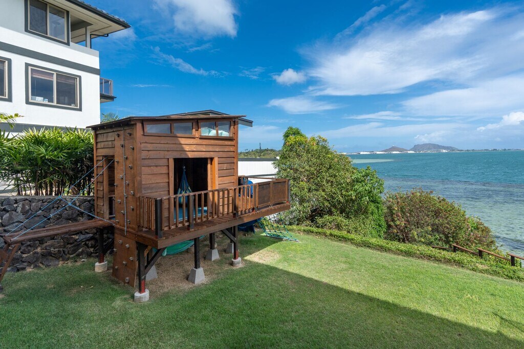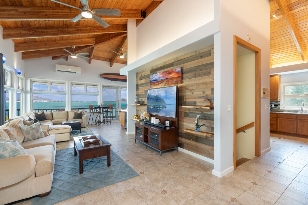 Enjoy waterfront living on Kaneohe Bay in this rare 2,724 square foot home with stunning views in all directions. Equipped with a three-car garage, this open concept tri-level home has incredible high vaulted wooden ceilings, four bedrooms including two master suites with walk-in closets, 3.5 bathrooms, and a bonus space fit for an office or playroom. The main level of the home is perfect for entertaining with a spacious living room, wet bar with both a wine refrigerator and beverage cooler, and a gourmet kitchen with an island, Sub-Zero refrigerator, gas range, and plenty of cabinet and pantry storage. There are six split air conditioners, including one in each bedroom, throughout the house. Enjoy over 800 square feet of lanai space, split between two levels, overlooking the bay. In the spacious, flat backyard, a custom-built playhouse with a climbing wall and slide will provide hours of family fun. Steps from the backyard will take you down to a lower deck and provide bay access. The house is powered by a robust solar power system and batteries, and has a Tesla wall charger in the garage. Long term lease terms available for 12 to 18 months and include water, sewer, general pest control and landscaping. Electricity and internet/cable are tenant's responsibility. Sorry, no pets and no smoking allowed. Rent is $7,500 per month and a security deposit. No application fee at so apply today! Property is professionally managed by Private Homes Hawaii, LLC. For more information or to schedule a viewing, please call Lisa Schultz (RS - 76696) at .