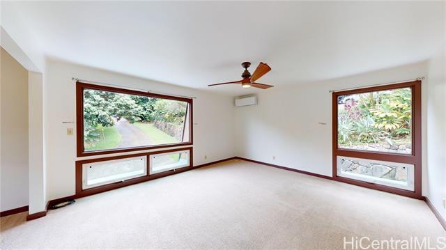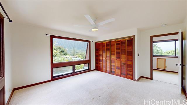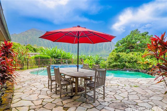 A Rare Gem with Stunning Ko'olau Mountain Views! Embrace the beauty of island living in this remarkable 6-bedroom, 3.5-bathroom residence, boasting approx. 3,912 sq. ft. of thoughtfully designed space - perfect for family gatherings, entertaining, or simply relaxing. You're welcomed by a sunken living room with soaring ceilings, a charming wood-burning fireplace, and sliders that open to the lanai and swimming pool. Adjacent to the living room is a formal dining area, distinct from the casual eat-in kitchen. Nearby is the half bath, a spacious storage room, and a dedicated laundry area. The main level features a primary suite with a sitting area, split AC, en-suite bathroom, a spacious dressing area, and two closets. Upstairs, 5 additional bedrooms and 2 full baths provide ample flexibility, all complemented by breathtaking vistas. Two-car carport and an extended side driveway ensure ample parking space, while the home's solar panels reduce utility costs. Easy access to H-3, Kailua Beach, Kaneohe Marine Corps Base, shopping & restaurants. No Pets. No Smoking. Renters Ins. required. O ccupants must qualify on their own-co-signers are not allowed. $30.00 application fee per adult.