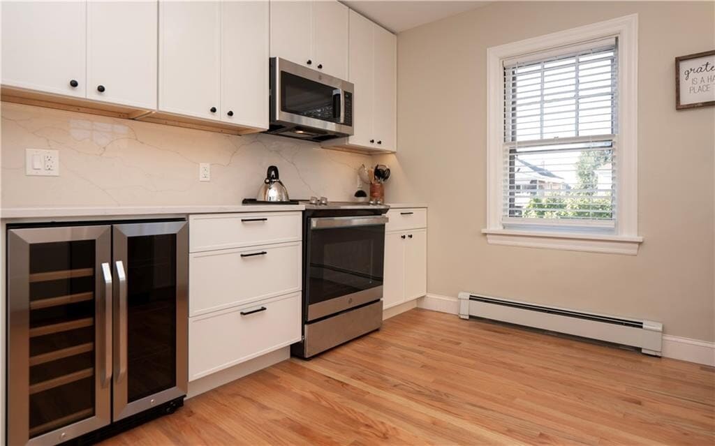 Available monthly. Rates include all utilities Sept $4000 / Oct $3400 / Nov $3200 / Dec $3200 /Jan $3200 / Feb $3200 / March $3200 / April $3200 / May $3500 / June $7500. Completely remodeled in 2022,this 2 BR condominium includes the former Billiards Room built for the original house known as Heartsease & retains much of its former detail and splendor. Centrally located in an elegant neighborhood in easy walking distance of Bellevue Ave and Broadway. Upon entering,your eyes are drawn upward to the soaring 13' ceiling with a curved vault framed by intricately carved decorated molding. Whimsically modern bubble light chandeliers float over the great room,gleaming on detailed original hardwood floors. The kitchen is a thoroughly modern but soft & inviting space with white quartz countertops and backsplash. Appliances include a french door GE refrigerator; a convenient built-in wine & beverage chiller plus dishwasher. The new bathroom has a shower over tub,floating vanity and new yet classic subway & penny tile. The primary bedroom offers a stunning ceiling feature highlighted by a modern light fixture. This room offers two large closets,high ceilings and the original chest high wainscoting. The ceiling boasts original detail and gives this room an elegant,hotel-like feel. The second bedroom is currently styled as a guest room,but would easily convert to an office. Private,separate entry. Shared outdoor spaces and porch,dedicated parking for one car and onsite laundry.