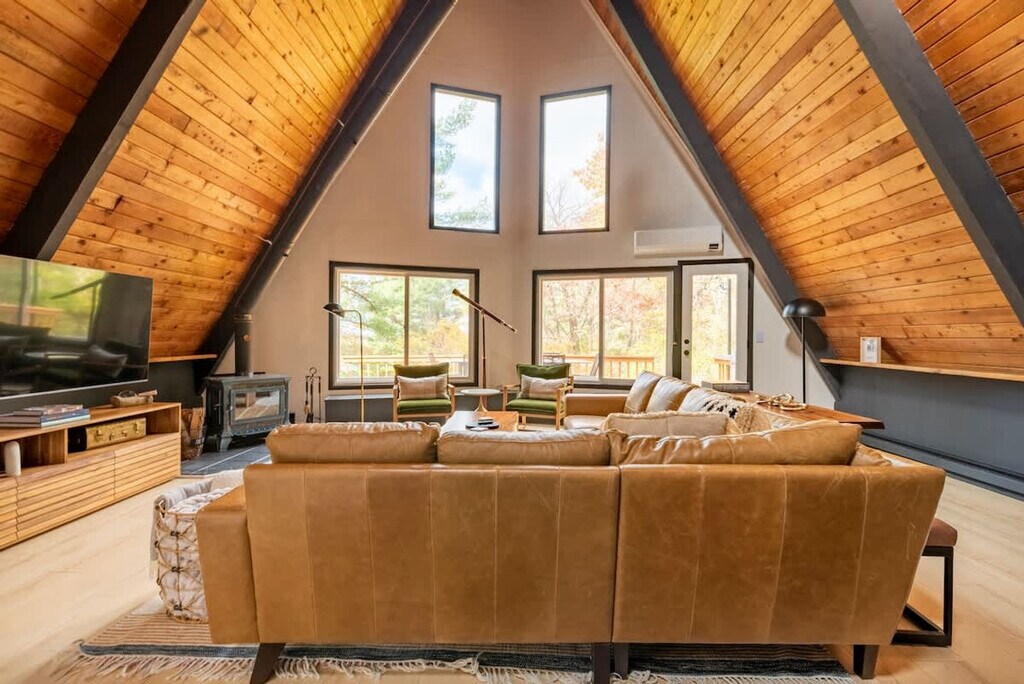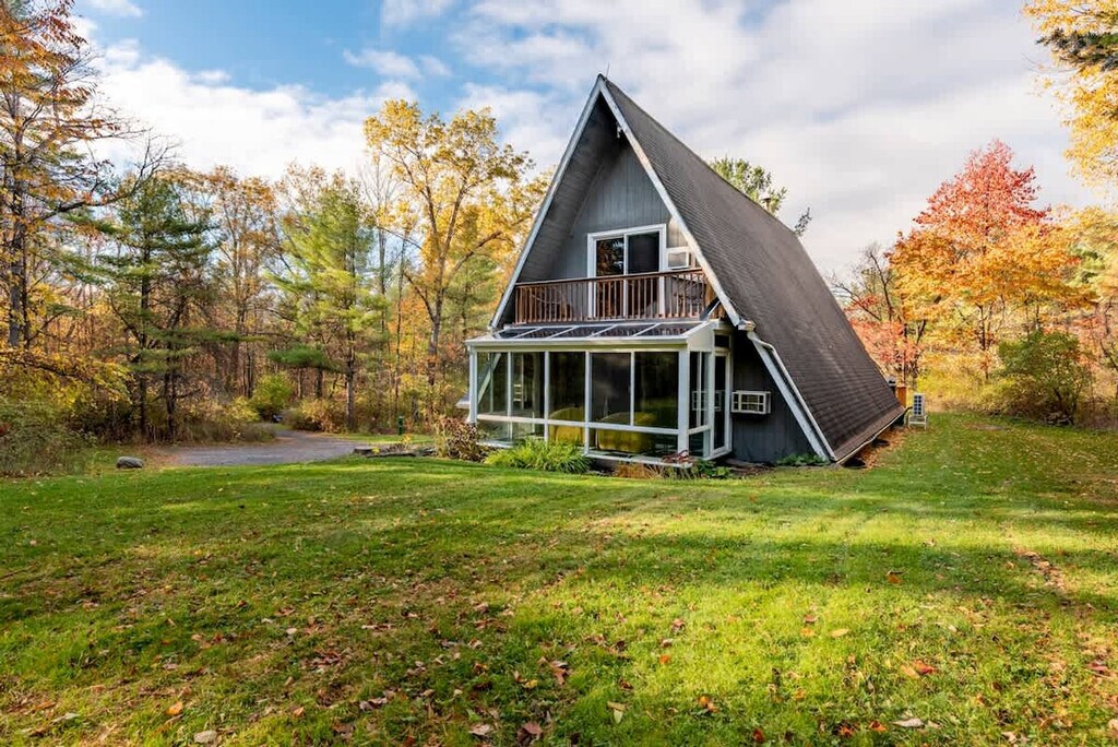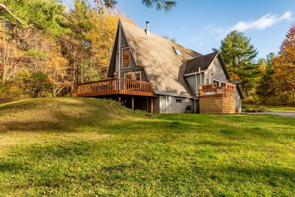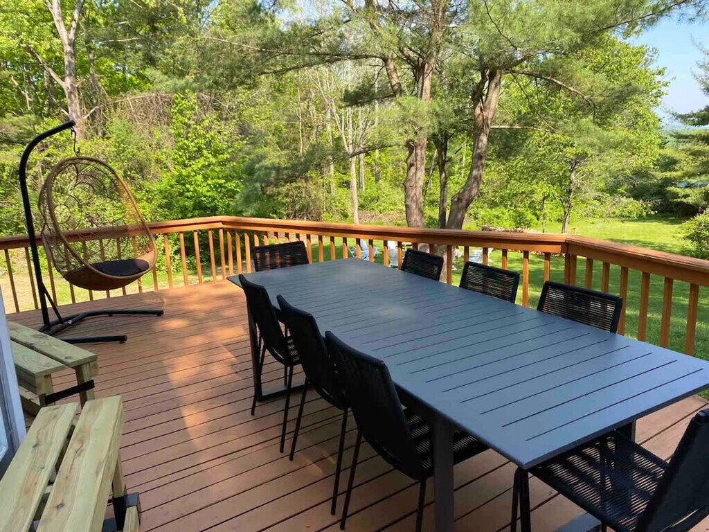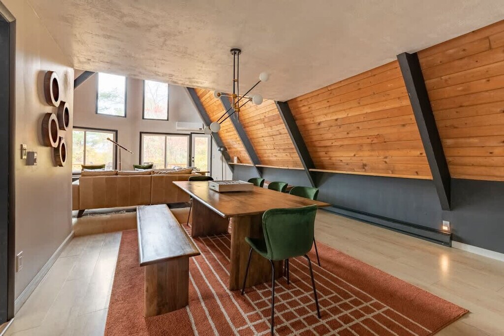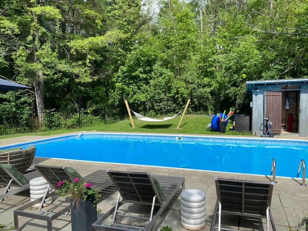 Feel at home in this revitalized luxury A-frame with all the modern amenities you need for your Finger Lakes adventure. This home features three bedrooms and a Murphy bed in the game room on the lower level. The house is located outside of town on 2+ private acres. It wouldn't be camp without a pool, so this home has a large heated in-ground pool open May 15th to October 1st. An EV charger is available. Dogs are welcome. You'll need to adventure outside of town to get this level of privacy and peace. The house is in a rural setting with a 15-minute drive to downtown Ithaca. Quiet hours are between 10:00 PM and 7:00 AM.