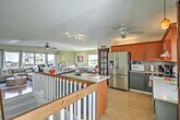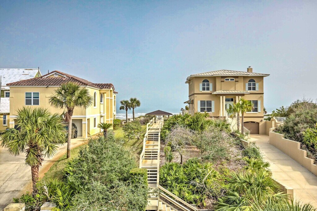 Feel at home in 'Seascape,' an alluring 4-bedroom, 3-bath home in St. Augustine. This 3-story home offers Atlantic Ocean views from two balconies. This 2,400 sq ft home features 4 smart TVs, a DVD player, a dining table, and ceiling fans. The fully equipped kitchen includes a breakfast bar, drip coffee maker, toaster, water filter, ice maker, spices, a Crock-Pot, and dishware/flatware. Other amenities include central heating and air conditioning, a washer and dryer, a Rainsoft water filtration system, linens, towels, beach towels, and a hair dryer. Dogs are welcome with a pet fee of $150. Enjoy direct beach access and great proximity to historic St. Augustine. Stairs are required to access the kitchen. There are three exterior security cameras: one on the front door facing the entry, one next to the upstairs floodlight facing the driveway, and one in the floodlight on the back of the house facing the rear driveway. These cameras are outward-facing and actively record video and sound while guests are in residence and will be motion-activated. Mail delivery is not allowed, but package deliveries are allowed. Stays over 30 days will require a mandatory cleaning at the renter's expense during the stay, coordinated with the owner. Guests must be at least 25 years old to book. Guests will have access to the entire property via keyless entry. [SI]