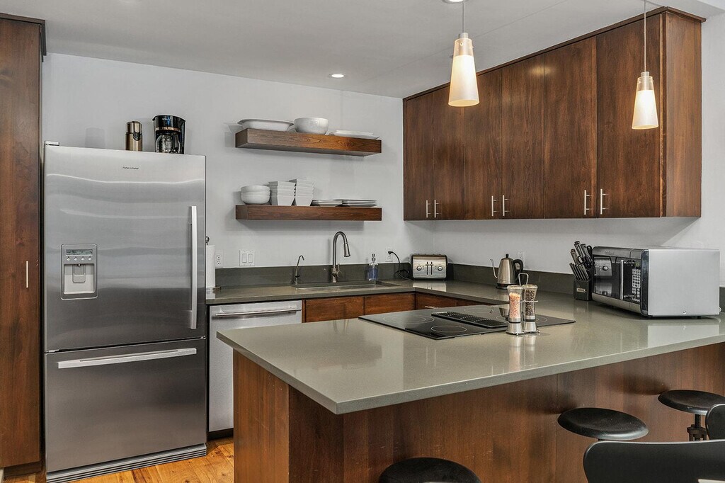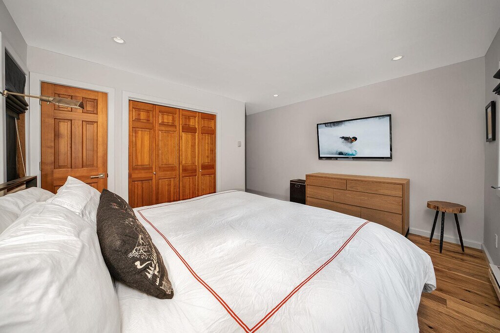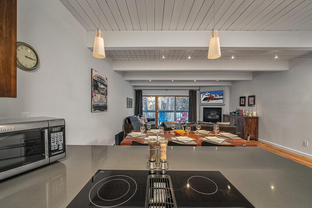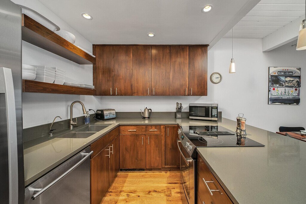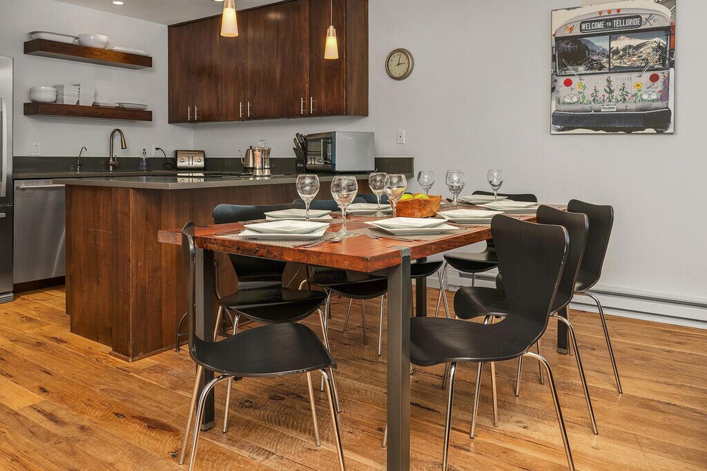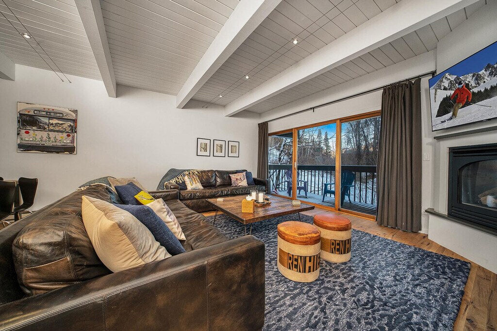 Feel at home in Riverside C03, a deluxe two-story, 2-bedroom condo in the heart of Telluride. Just two and a half blocks from the Gondola, Main Street, and Town Park, this condo combines an unbeatable location with modern comfort. This stylish condo is designed with comfort in mind and features a gas fireplace, two oversized leather sofas, a 50” Smart TV with Apple TV, Bluetooth speakers, and hickory wood floors throughout. The fully equipped kitchen features stainless appliances, reverse osmosis water filtration, and formal dining for 8. There is also a washer and dryer and a walkout patio with seating. Off-street parking is available with a permit for 1 vehicle. Walk to the Gondola, Main Street dining, shops, and Telluride Town Park. Enjoy easy access to Bear Creek Trail for skiing in winter and hiking to the falls in summer. This property is available for 30-night minimum stays during the off-season at a special monthly rate of $6,000, plus a cleaning fee and damage protection. If you pay by credit card you will be charged an additional 5% credit card processing fee. Registration Number: 14644 [SI]