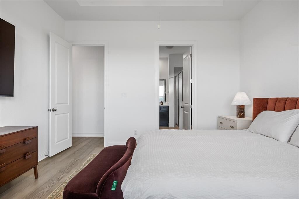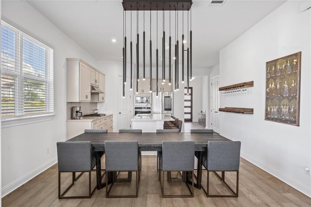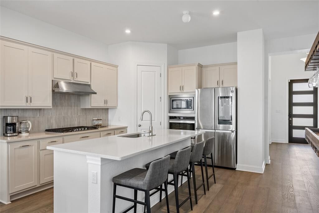 Beautiful single-story home in the Travisso community of Leander. Built in 2021, this 3-bedroom, 2-bath home offers 2,150 sq. ft. of living space backing to a greenbelt. Features include wide-plank engineered wood flooring throughout (no carpet), quartz countertops, stainless steel appliances, and a kitchen with a spice rack pull-out. Open-concept floor plan with modern fixtures and a dedicated home office. Washer, dryer, two refrigerators, and outdoor mounted TV. Covered patio overlooks the greenbelt. Travisso amenities include a clubhouse, fitness center, pool, and trails. Located in Leander ISD with easy access to shopping, dining, and major roadways. MLS ID 1406157