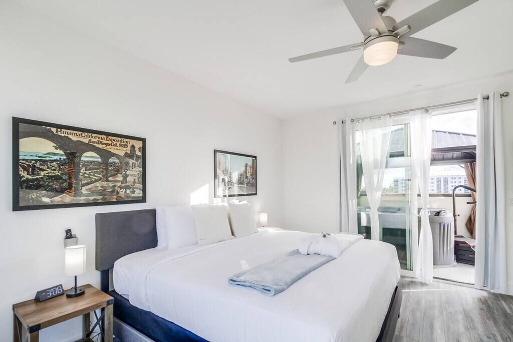 Feel at home in this recently constructed apartment that complies with ADA standards and offers elevator access. Situated in the heart of University Heights, this spacious apartment features an open-layout design and 10-foot ceilings that create a light, bright, and airy ambiance. This apartment features a fully stocked kitchen with stainless steel appliances and a smart Samsung refrigerator. Enjoy the convenience of a washer, dryer, and iron, as well as smart TVs in the living room and both bedrooms. A private balcony with a propane grill and a primary bedroom with a king-size bed and private balcony with a hot tub complete this apartment. Secure, below-ground parking is available. Nestled around all the entertainment that University Heights offers, this apartment provides a modern layout and finishes. Enjoy the vibrant neighborhood with its unique boutiques, eateries, and lively atmosphere. With a walking score of 87, plenty of activities are within reach. For anything outside of the neighborhood, a vehicle or Uber is recommended. San Diego Zoo, Balboa Park, Old Town San Diego, Little Italy, Seaport Village, Mission Beach, Pacific Beach, La Jolla Cove, SeaWorld San Diego, Torrey Pines State Natural Reserve, LEGOLAND California and Disneyland Park are all within a short drive. Pets are not allowed. There is no smoking of any kind (tobacco, marijuana, hookah) on the property. The fine is $500 for smoking. Occupants exceeding the number declared on the reservation will not be permitted to stay past 10PM. Children and infants are considered occupants. No more than 3 guests above the stated number of occupants in your reservation are allowed on premises at any time. Only small speakers playing at low volume are allowed outside. Noise complaints constitute a violation. If any of the strict rules are violated, we reserve the right to cancel your reservation without refund and immediate eviction may occur. Due to the spa being on the second floor balcony, the only way for the spa vendor to access the spa for servicing is through the bedroom. The spa vendor will knock on the door before entering. Please do not turn them away as the spa may become unusable and require extra maintenance if they are unable to service. Guests may have packages delivered to the property during their reservation dates. However, we strongly advise coordinating deliveries for when you are on-site to receive them. The host cannot be held responsible for any packages that are lost, stolen, or damaged prior to or during your stay. San Diego now requires all guests to sign a Good Neighbor Policy document prior to staying. We do enforce their policy so it must be signed in order to receive checkin info, but we will make it super easy for you to initial and sign. It can all be done online. Includes a dedicated workspace and high-speed Wi-Fi. Registration Number: STR-06657L [SI]