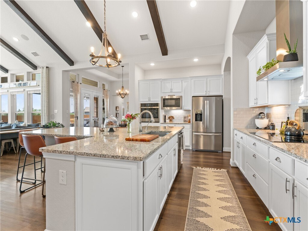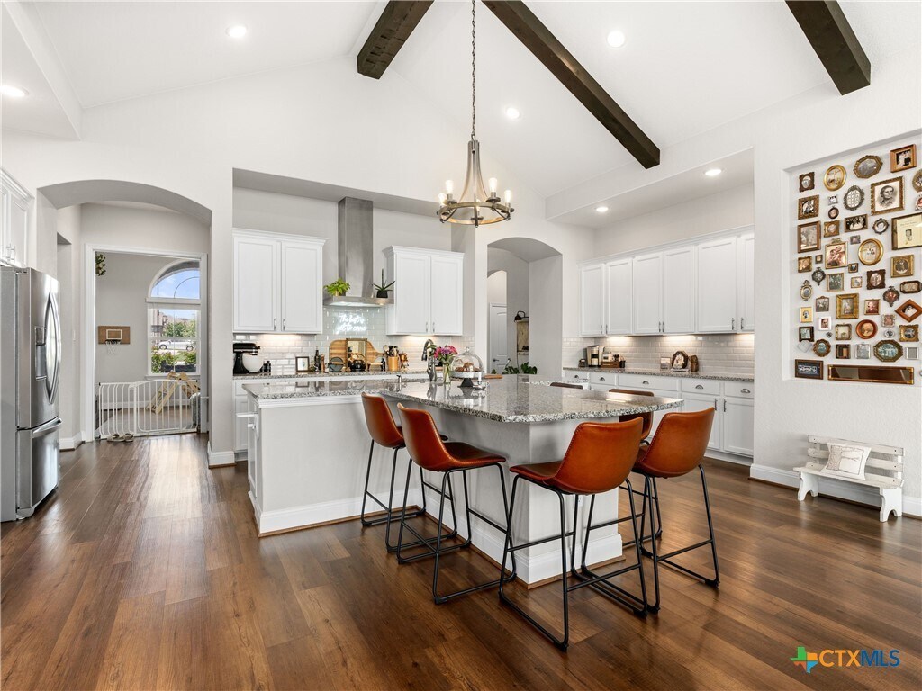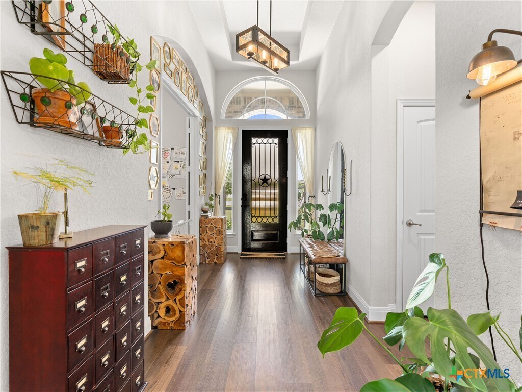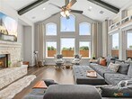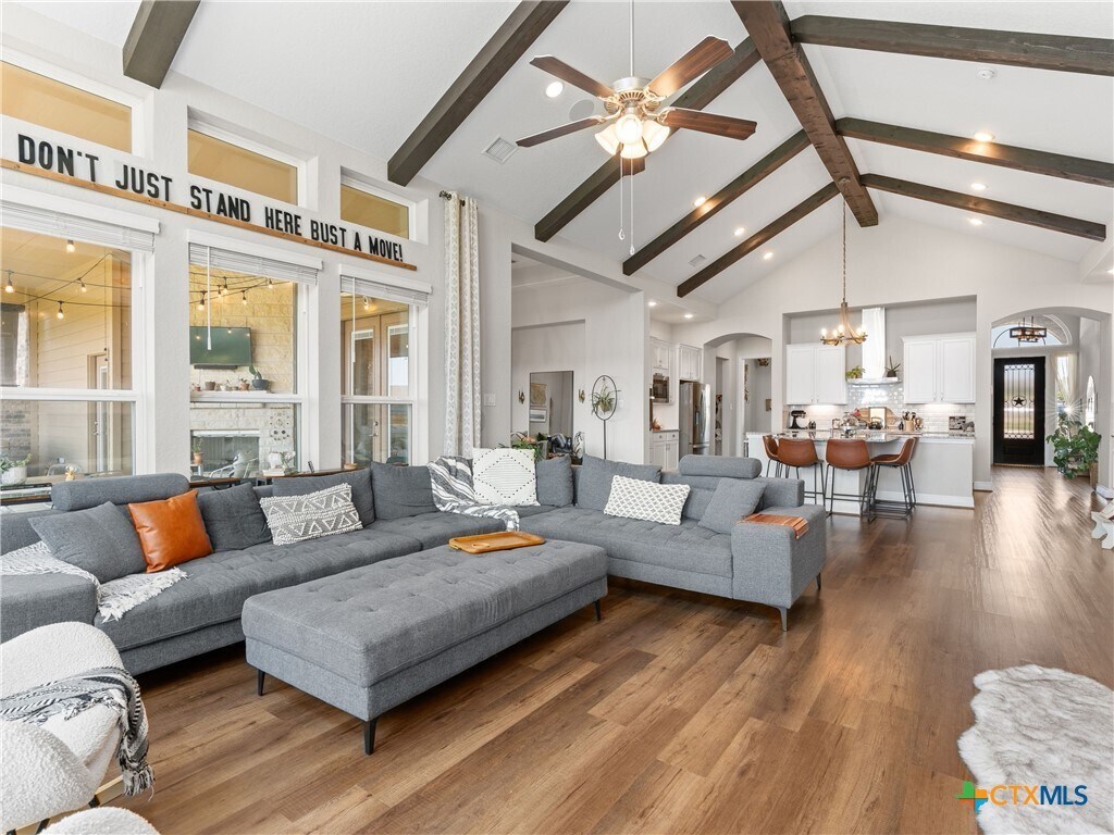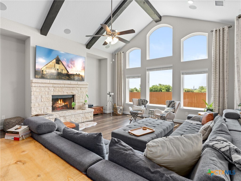 Impressive curb appeal,soaring ceilings,and stunning interior finishes set the tone for this standout residence in the desirable Harvest Hills community. With 4 bedrooms,3.5 baths,and over 3,269 square feet of thoughtfully designed living space,this home offers the perfect blend of sophistication and comfort. Step inside to a bright,open-concept layout anchored by a show-stopping kitchen-featuring a massive granite island,abundant cabinetry,stainless steel appliances,and a sleek vent hood that ties it all together. Rich lvp flooring,beamed ceilings,and oversized windows enhance the home's natural elegance,while multiple living and dining areas provide flexible functionality. The spacious primary suite is a peaceful retreat with a dramatic wall of windows,tray ceilings,and a spa-inspired en suite bath with dual vanities,a soaking tub,and a walk-in shower. Secondary bedrooms are generously sized with ample closet space and designer details. Step outside and you'll find one of the home's true highlights: a covered outdoor living area complete with a stone fireplace,string lighting,and space to dine,unwind,or soak in the hot tub. Best of all,the home backs to green space with no rear neighbors,offering added privacy and a peaceful backdrop for outdoor entertaining. Situated on a .32-acre lot with a 3-car garage and access to community amenities,this home checks all the boxes for luxury living in a relaxed Hill Country setting.
