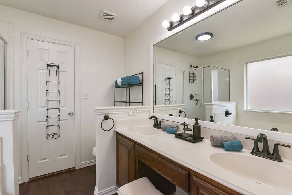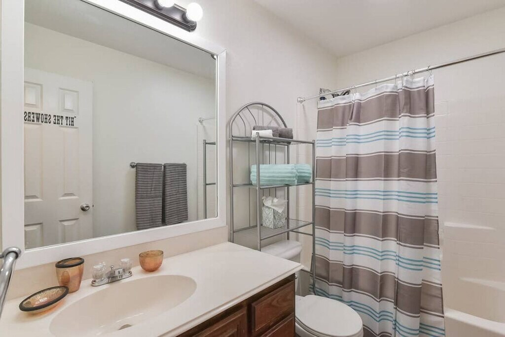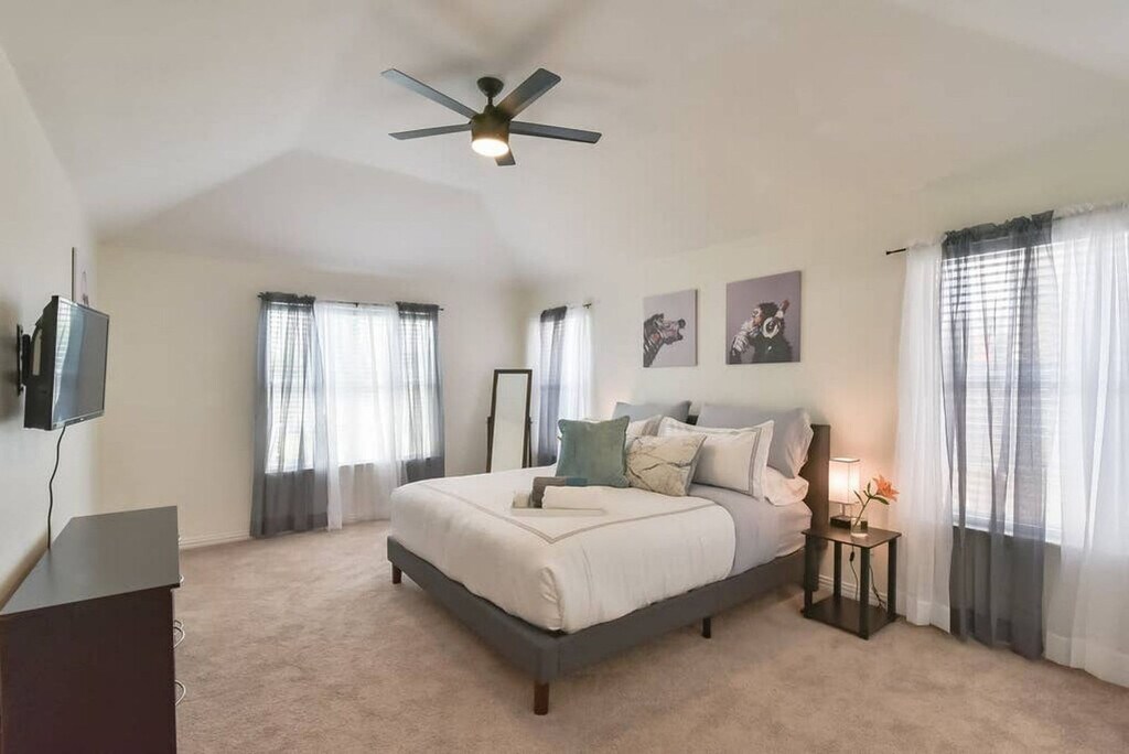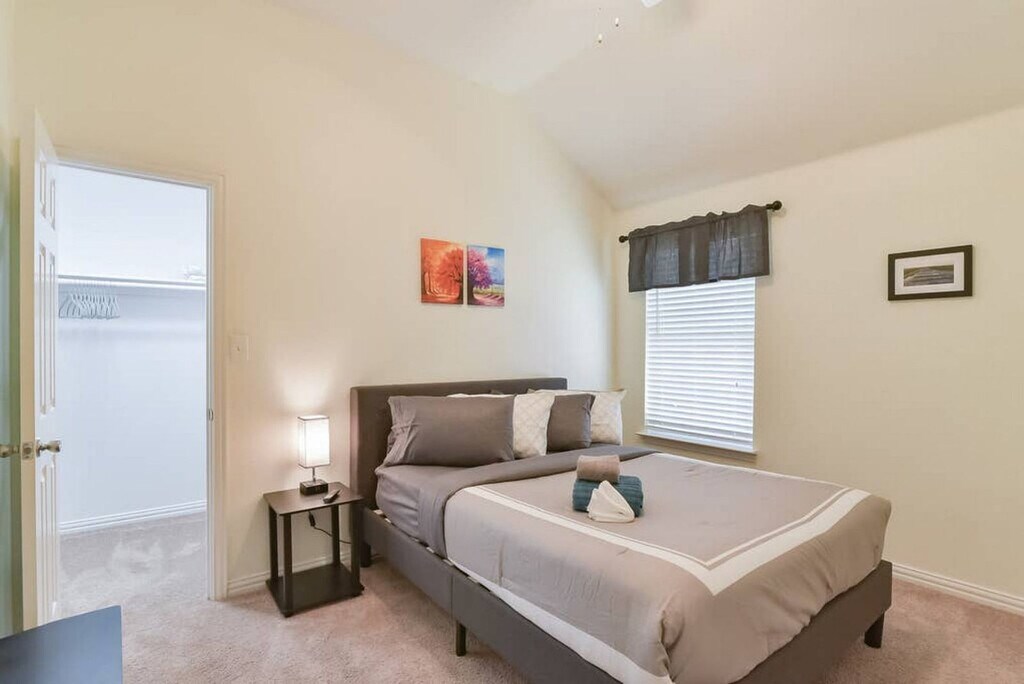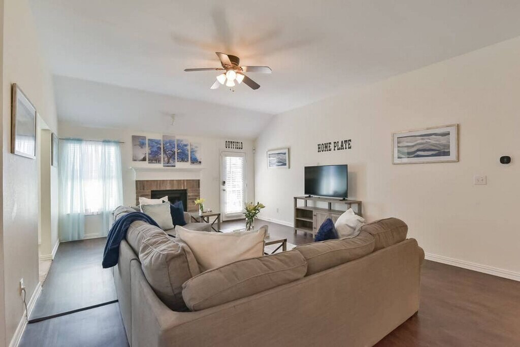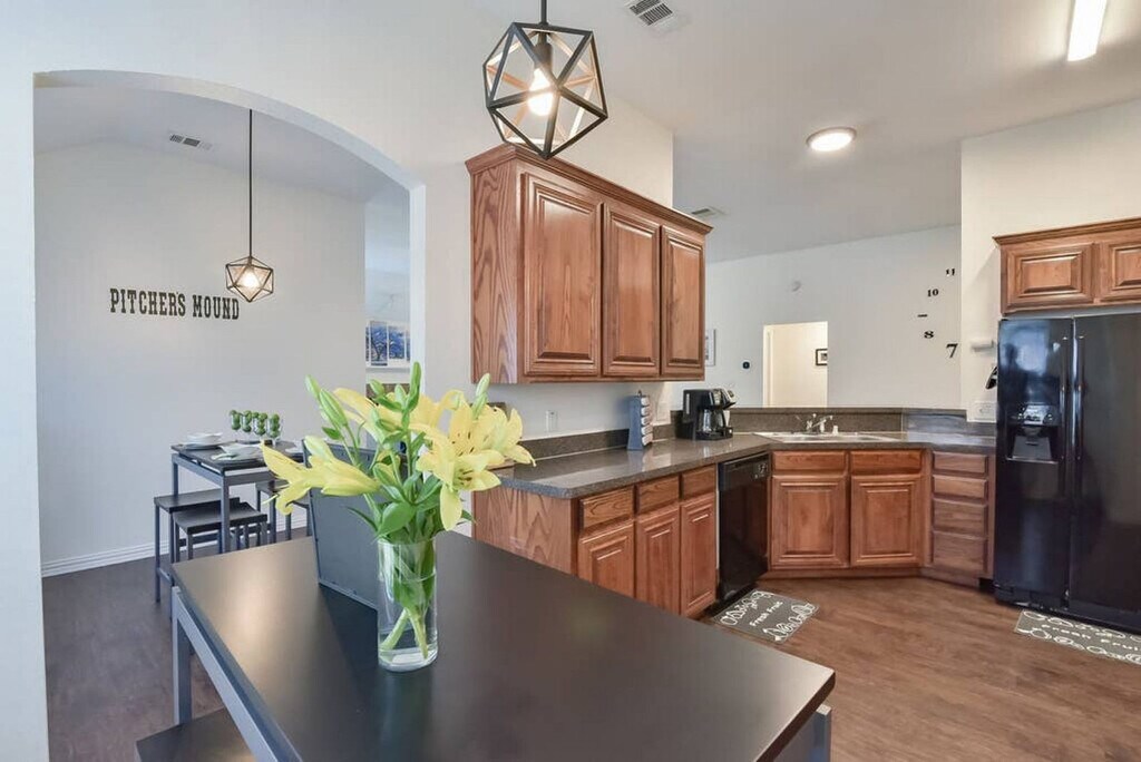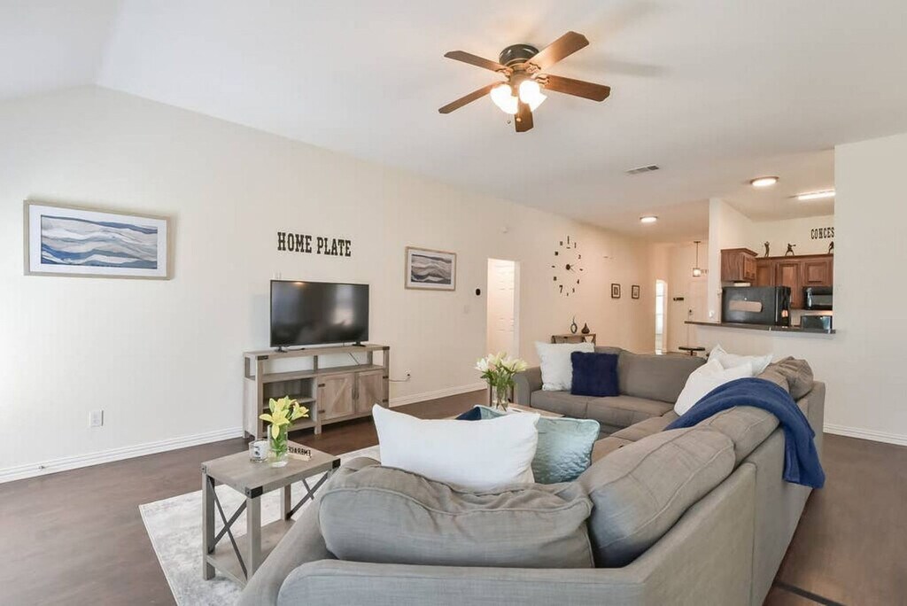 Discover a gem in Mansfield with this eye-catching, modern-styled 3-bedroom, 2-bathroom home nestled in a quiet neighborhood. Surrounded by popular amenities such as Big League Dreams, Joe Pool Lake, and Mansfield National Golf Course, this home offers easy access to attractions like AT&T Stadium and the ballpark. Sporting events are a highlight in Mansfield, and the subtle yet attractive sporting decor throughout the interior showcases what the area has to offer. Feel at home with full use of the four smart Fire TVs throughout the home, each room and living space equipped with plugs and dedicated USB power chargers. The fully stocked kitchen includes all the pots, pans, plates, bowls, glasses, cups, and cooking utensils you might need, along with a pantry filled with a variety of spices. Enjoy the back patio with comfortable seating for six, a gazebo, grill, and Corn-Hole for leisure. The game room features a 10-in-1 combination multi-game table and a professional-style octagon poker table for entertainment. This dog-friendly home allows up to two dogs, each weighing up to 20 lbs, for an additional $30 per pet, per night. The garage is accessible for up to two normal-sized cars, though garage opener remotes are not supplied. Early check-in and late check-out requests must be approved in advance and may incur additional fees. Just down the street, enjoy a quiet walkway known as the 'Green Belt,' leading to the community pool, park, and soccer goals. Head north on Holland Street to reach Historic Downtown Mansfield on Main Street, passing popular restaurants along the way. The 360 Tollway provides easy access to local attractions like Arlington Parks Mall, Grand Prairie Outlet Mall, and Arlington Highlands. For thrill-seekers, Six Flags Over Texas and Hurricane Harbor are just a short drive away. Check-in is after 4:00 PM and check-out is by 11:00 AM, with self-check-in available through SmartLock. No parties or events are allowed unless explicitly granted privilege in writing. Unauthorized parties will incur a $500 fee, and guests may be asked to vacate immediately without a refund. Smoking is not permitted inside the house or within 6 feet of any doorway. Guests are expected to respect neighbors and address any complaints through provided contact information. Stay connected with Wi-Fi, Netflix, and smart TVs available for your use. The home is equipped with an exercise bike in the game room, which can be positioned in front of the TV for your leisure. [SI]