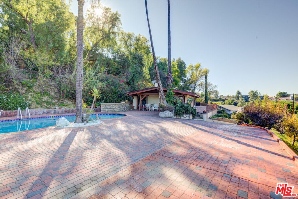 RARE ENCINO COMPOUND FOR LEASE! 4 bed, 3 bath updated home on a huge 36,000 square lot! If you are looking for endless views & privacy in the Encino hills, this home is the one for you. The long private driveway leads to an amazing scene - panoramic views of the valley and a gorgeous pool. There is also a ton of parking for guests - you can easily fit at least 10-15 cars. On the other side of exterior, enjoy the backyard area. There is a garage for extra storage or parking. As you walk into the home, you are invited into a spacious living room with a fireplace, windows for natural light and views, and a sliding door that leads to the exterior. There is also a bedroom/bathroom that leads to the exterior. Enjoy the updated bathrooms and kitchen - the kitchen has all new appliances! Next to the kitchen is a large open dining room with extra living room space for entertaining. On the other side of the house you will be welcomed to three bedrooms and 2 large master style bathrooms. The master suite is fantastic with a beautiful en suite bathroom that leads to the backyard/exterior. Enjoy the new laminate flooring and mixed marble/tile throughout the home. Super cozy home on on a very rare huge lot with rare views and privacy. MLS# 26637175