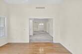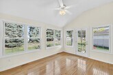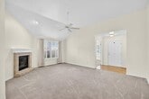 Open feeling, vaulted ceiling villa at back of cul de sac neighborhood. Corner fireplace in open living room. French doors to den w/bay window. Primary suite with vaulted ceiling, hardwood floors in generous bathroom and walk-in closet. Open kitchen with corner sink, all appliances and pantry. Sunroom leads to covered back porch. Laundry room w/hardwood floor, washer and dryer and utility sink, convenient to the attached garage.
