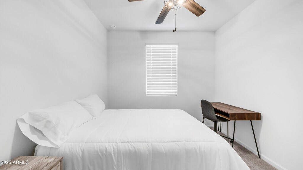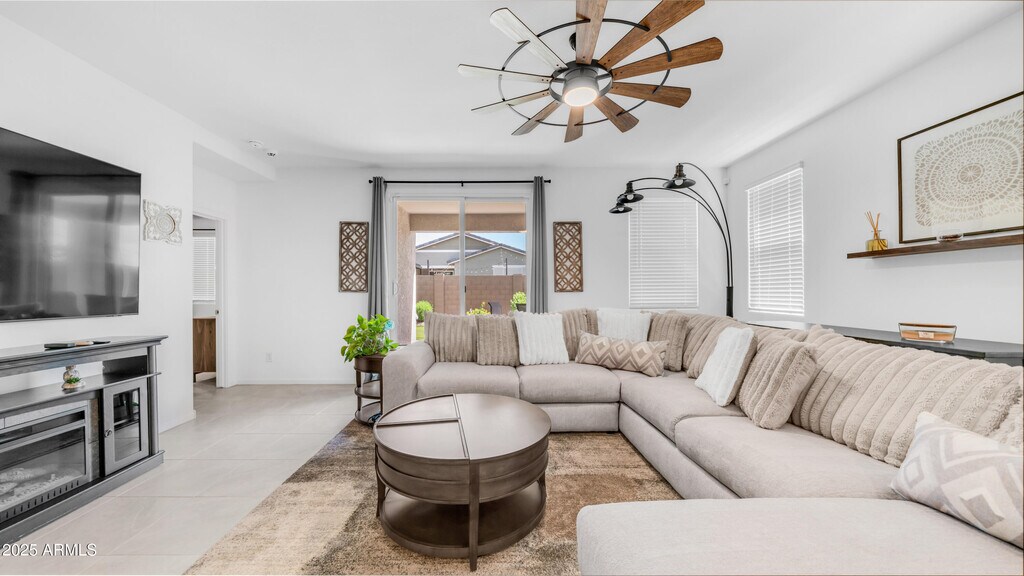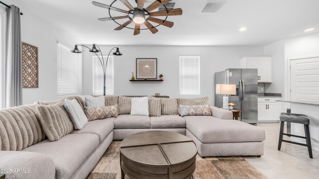 Welcome to Alamar,a vibrant master-planned community in the West Valley where family,nature,art,and wellness come together daily. This beautiful FULLY FURNISHED,Lennar-built single-level home features an open floor plan with a professionally landscaped backyard with putting greenperfect for entertaining or relaxing. Inside,the open-concept design connects the kitchen,dining nook,and Great Room seamlessly,leading to a covered patio for effortless indoor-outdoor living. The luxurious owner's suite offers privacy and comfort,while three secondary bedrooms at the front of the home provide space for family,guests,or a home office.
