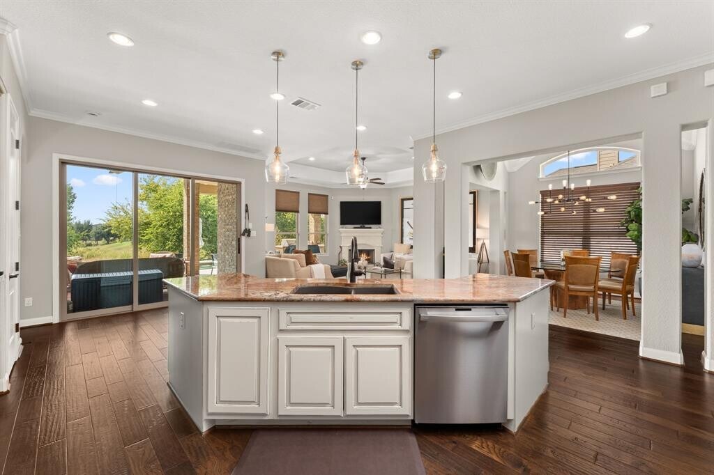 Nestled in the highly sought-after Teravista community on a quiet private drive, this exceptional home offers the ease of single-story living with thoughtful bonus spaces above. The main level features the primary living areas, including 4 spacious bedrooms and 3.5 baths, while the second level is dedicated to an impressive movie theater and bonus room, perfect for entertaining or relaxing. Set along the golf course, the home boasts breathtaking views from the covered porch and resort-style pool and spa. An outdoor kitchen completes the backyard, creating the perfect setting for entertaining and enjoying Texas evenings. Inside, a gourmet kitchen anchors the home with high-end finishes and flows seamlessly into the family and dining rooms, making it ideal for gatherings both large and small. Additional highlights include a private courtyard that adds charm and privacy, as well as a two-car garage. Combining luxury, functionality, and an unbeatable location, this home truly delivers the best of Teravista living. MLS ID 3295732